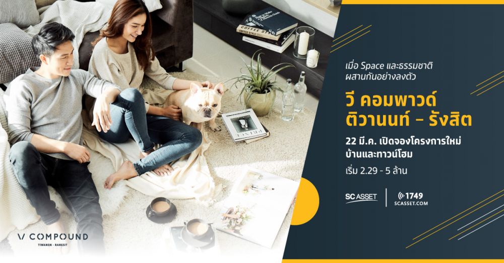 บริษัท เอสซี แอสเสท คอร์ปอเรชั่น จำกัด (มหาชน) เตรียมเปิดตัวโครงการใหม่ วี คอมพาวด์ ติวานนท์-รังสิต (V Compound Tiwanon-Rangsit) ที่มากับ 3 แบบบ้านให้เลือก ทั้งบ้านแฝด และ ทาวน์โฮม 2 ชั้น ภายใต้แนวคิด Organic Living บนทำเลศักยภาพติดถนนใหญ่ติวานนท์ ใกล้ห้างโรบินสันศรีสมาน และทางด่วน