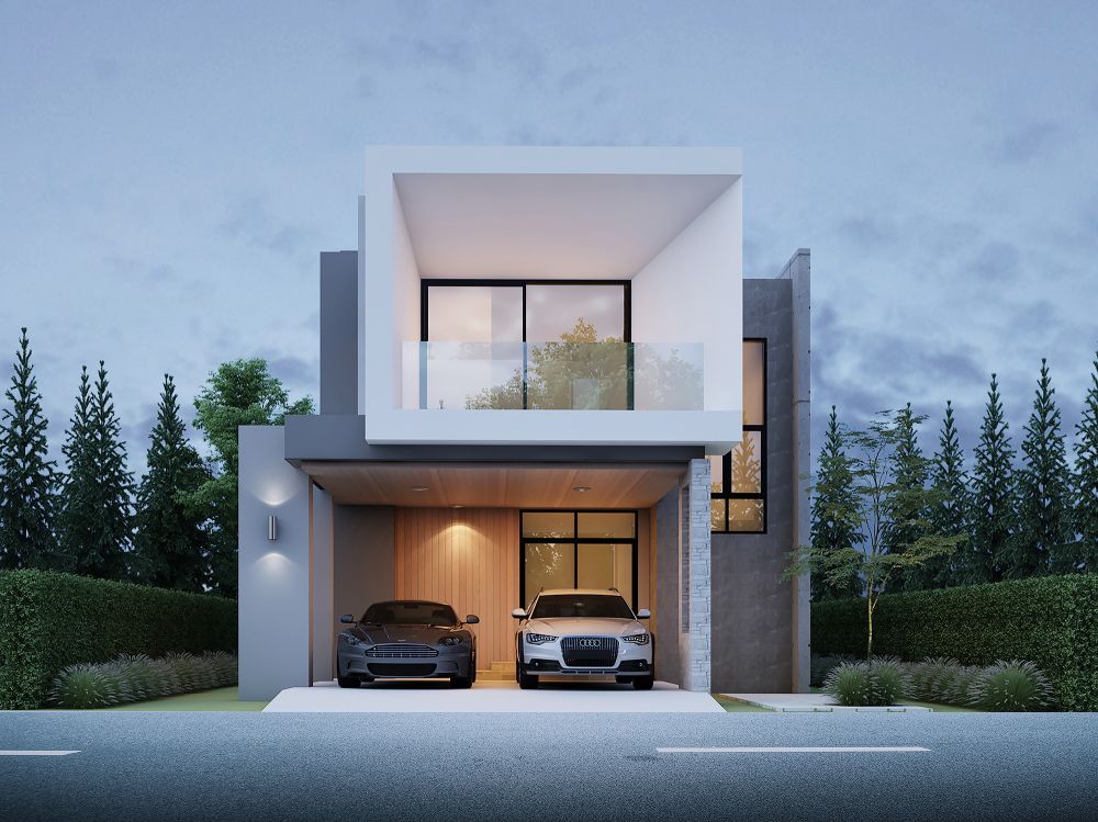 การออกแบบดีไซน์ทรง Box หรือทรงกล่อง 2 ชั้น เหมาะกับที่ดินทรงสี่เหลี่ยมผืนผ้า แบบบ้านทรงหน้ากว้าง พอดิบพอดีกับครอบครัวระดับกลาง มีพื้นที่จอดรถถึง 2 คัน หลังคาถูกออกแบบสไตล์โมเดิร์น สำหรับโทนสีของบ้านจะเน้นเป็นเอิร์ธโทน สีขาว เทา โอ๊ค ที่ดูเรียบง่ายแต่เท่ หน้าต่างโดยรวมดูดีมีดีไซน์หลากหลายขนาด