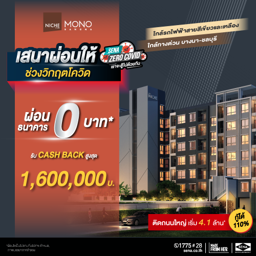 SENA ลุยช่วยเหลือลูกค้า ส่งแคมเปญ “SENA ZERO COVID” “ผ่อน 0 บาท นาน 6 เดือน” พร้อมรับ Cash back สูงสุด 1,600,000 บาท หวังเยียวยาลูกค้าใหม่ที่ต้องการที่อยู่อาศัย ทุกดีลพร้อมดูแล เริ่มตั้งแต่วันนี้ – 30 กันยายน 2563