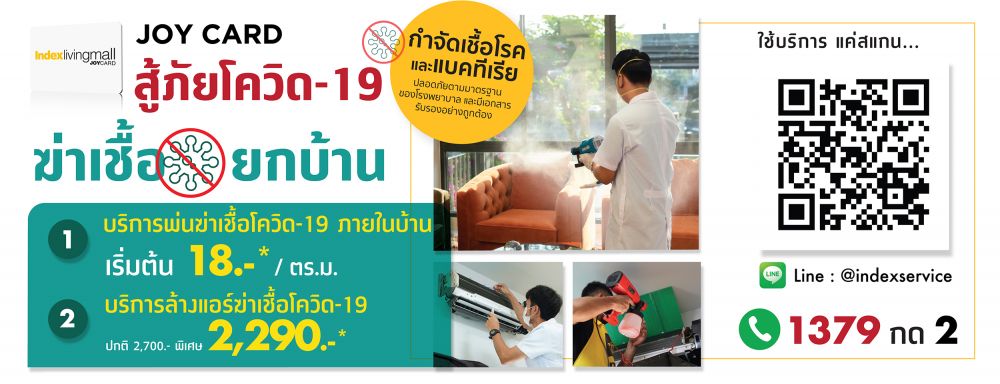 ทั้งนี้ เพื่อให้ช่วงเวลาของการ Work from Home เป็นไปอย่างมีความสุขและปลอดภัย จึงมอบสิทธิพิเศษสำหรับสมาชิกบัตร Joy Card ของอินเด็กซ์ ลิฟวิ่งมอลล์ ด้วยบริการฉีดพ่นฆ่าเชื้อโรค แบคทีเรีย และไวรัส COVID-19 ด้วยน้ำยาเกรดพรีเมี่ยมจากเยอรมัน ซึ่งเป็นสารในกลุ่ม non-flammable ไม่ก่อให้เกิดการลุกลามไฟ ปลอดภัยต่อร่างกายและเป็นมิตรกับสิ่งแวดล้อม กับโปรโมชั่นบริการฉีดพ่นฆ่าเชื้อ ราคาเริ่มต้นเพียง 18 บาทต่อ ตร.ม. (จากปกติ 25 บาทต่อ ตร.ม)