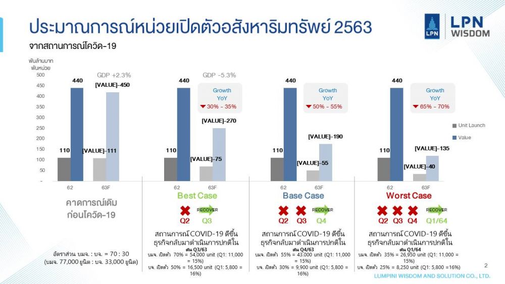 กรณีที่สถานการณ์การแพร่ระบาดของไวรัสโควิด-19 คลี่คลายลงในไตรมาสสองของปี 2563 เศรษฐกิจฟื้นตัวในไตรมาสสามของปี 2563 LPN Wisdom คาดว่าจำนวนการเปิดตัวโครงการใหม่ในปี 2563 จะอยู่ที่ 70,000-75,000 ยูนิต คิดเป็นมูลค่า 250,000-270,000 ล้านบาท หรือลดลงร้อยละ 30-35 เมื่อเทียบกับปี 2562