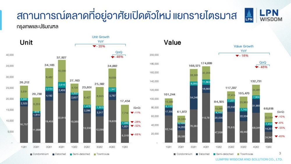 ในขณะที่ไตรมาสแรกของปี 2563 บริษัทอสังหาริมทรัพย์มีการเปิดตัวโครงการใหม่ทั้งสิ้น 66 โครงการลดลงร้อยละ 23 จากการเปิดตัวโครงการใหม่จำนวน 86 โครงการในปี 2562 คิดเป็นจำนวนยูนิตที่เปิดใหม่ในไตรมาสแรกของปี 2563 17,180 ยูนิต ลดลงร้อยละ 38 เมื่อเทียบกับระยะเดียวกันของปี 2562 คิดเป็นมูลค่าโครงการเปิดใหม่ในไตรมาสแรกของปี 2563 61,950 ล้านบาท ลดลงร้อยละ 27 เมื่อเทียบกับมูลค่าการเปิดโครงการใหม่ 86,359 ล้านบาทในไตรมาสแรกของปี 2562