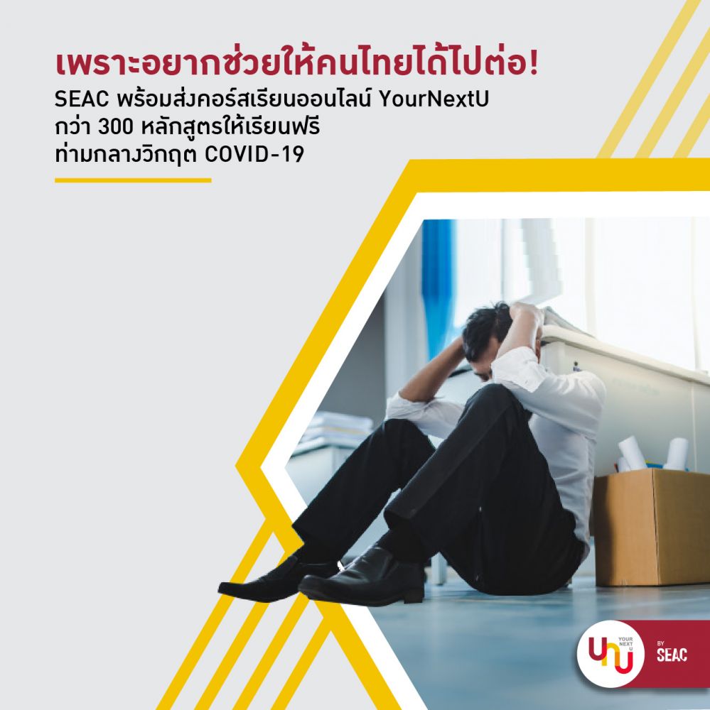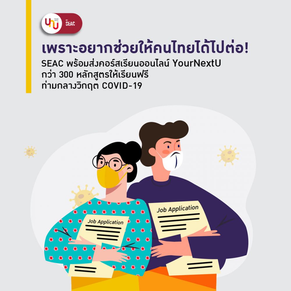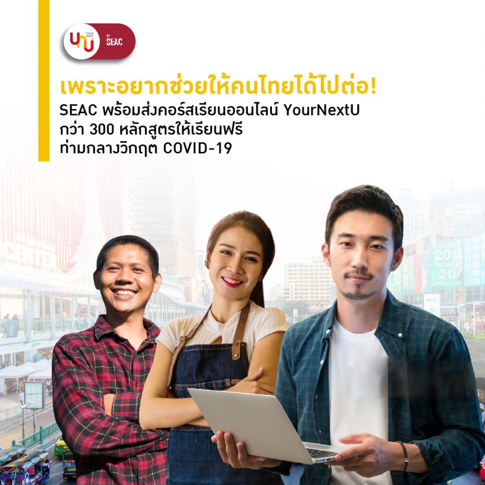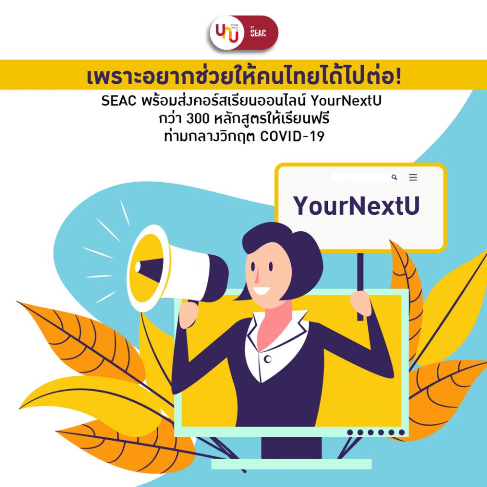 โดยส่วนหนึ่งของความตั้งใจของเรานั้นก่อให้เกิดโครงการล่าสุดที่ SEAC ได้ร่วมมือกับ กรมพัฒนาฝีมือแรงงาน กระทรวงแรงงาน มอบคอร์สเรียนออนไลน์กว่า 300 หลักสูตร ผ่านทางโมเดล YourNextU พร้อมทั้งคลาสพิเศษที่ช่วยถอดบทเรียนและถามตอบอย่างใกล้ชิดกับวิทยากรและผู้เชี่ยวชาญ เพิ่มโอกาสและทางเลือกให้ผู้ว่างงานหรือผู้ถูกเลิกจ้างเรียนฟรีได้ไม่จำกัดวิชาตลอดระยะเวลา 1 เดือน