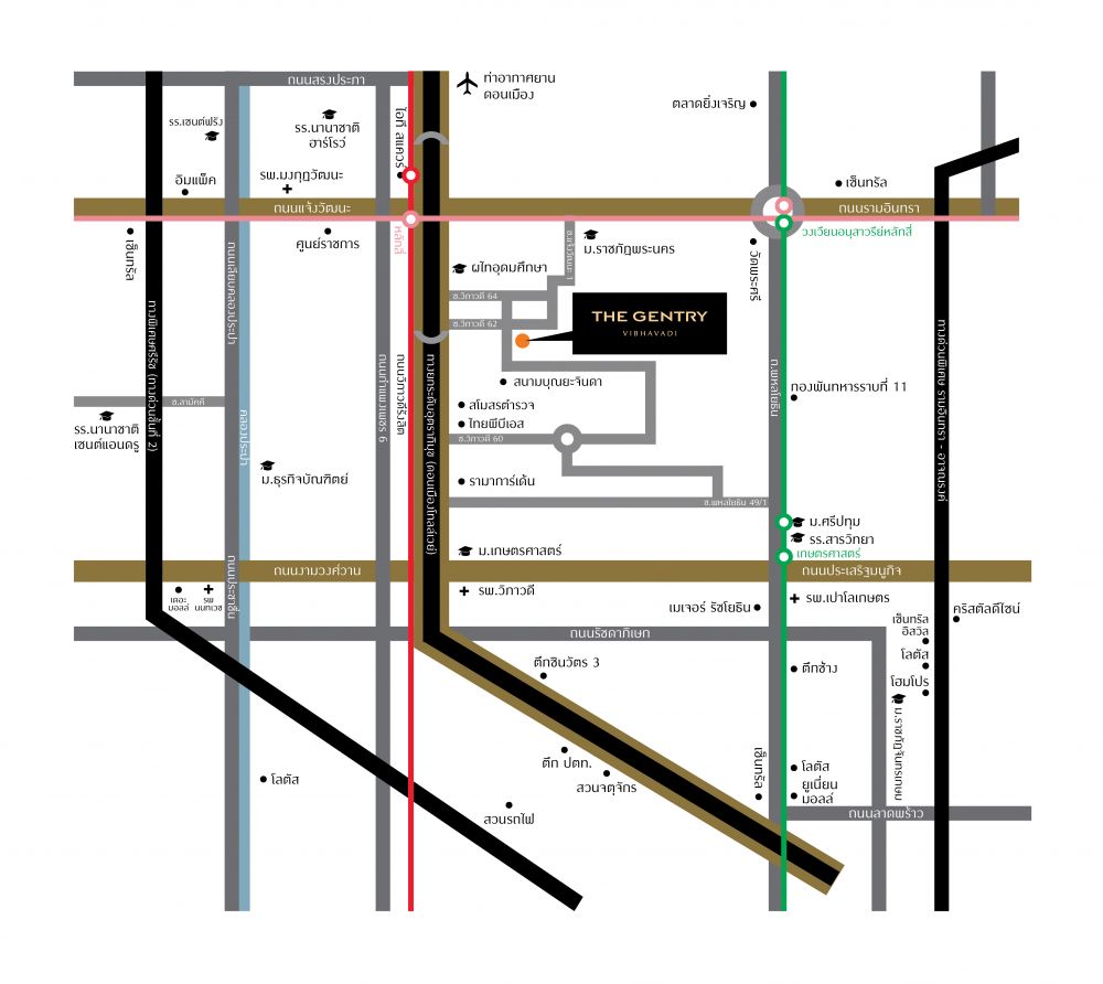 ที่ตั้งโครงการ THE GENTRY VIBHAVADI ถนนวิภาวดีรังสิต ซอย 62 โดยเข้าจากปากซอยเพียง 400 โครงการจะอยู่หัวมุมถนน 4 แยกด้านขวามือ