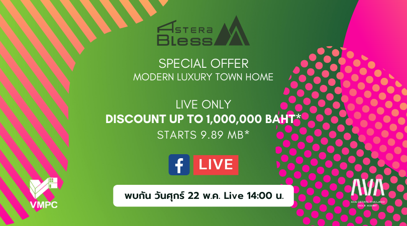 • แปลงมุมสวยพื้นที่ใหญ่สุด super bonus : รับดอกเบี้ย 0% 1 ปี * - รับส่วนลด 400,000 บาท* - ฟรีค่าส่วนกลางนาน 2 ปี* - ฟรีค่าธรรมเนียมการโอนกรรมสิทธิ์*เพียงจองสิทธิ์รับโปรพิเศษ 999 บาท ใน Live สด ผ่านเฟซบุ๊กแฟนเพจ: Astera Bless ในวันศุกร์ที่ 22 พฤษภาคม 2563 เวลา 14.00 น. เท่านั้น!