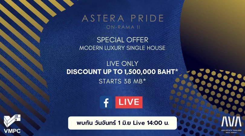 และ โครงการ “แอสเทรา ไพรด์” บ้านเดี่ยว 3 ชั้นสุดหรู ในราคาเริ่มต้น 38 ล้านบาท พร้อมข้อเสนอ สุดพิเศษ! ลุ้นรับส่วนลดสูงสุด 1,500,000 บาท* –ฟรี! ค่าใช้จ่ายวันโอนกรรมสิทธิ์* และสิทธิเพิ่มอื่นๆอีกมากมาย ผ่าน เฟซบุ๊ก แฟนเพจ: Astera Pride Rama II ในวันจันทร์ที่ 1 มิถุนายน 2563 เวลา 14.00 น.