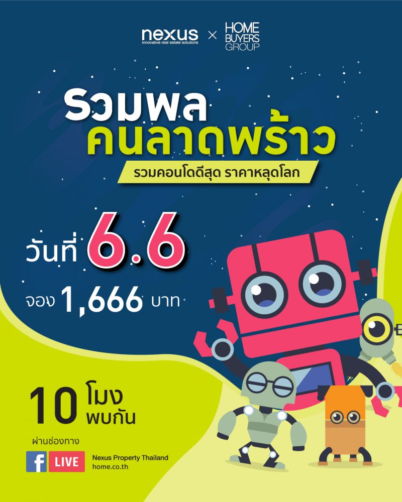 พบกัน วันเสาร์ที่ 6 มิถุนายน 2563 เวลา 10 โมงตรงเป็นต้นไป จองคอนโดราคาพิเศษเพียง 1,666 บาท* พร้อมโปรโมชั่นมากมาย ผ่านช่องทาง FB Live เพจ home.co.th และ Nexus Property Thailand