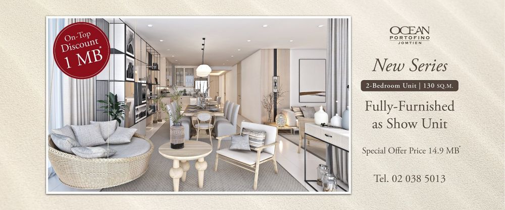 โอเชี่ยน พรอพเพอร์ตี้ บริษัทผู้พัฒนาอสังหาริมทรัพย์คุณภาพครบวงจร ส่งโปรโมชั่นสุดพิเศษกับโครงการ “โอเชี่ยน พอร์โตฟิโน่ จอมเทียน” คอนโดมิเนียมตากอากาศหรูริมหาดจอมเทียน สไตล์โมเดิร์น สูง 37 ชั้น โครงการพร้อมอยู่ที่มาพร้อมกับเนื้อที่สูดโอโซนขนาดใหญ่แห่งใหม่ในพัทยากว่า 120 ไร่ เน้นการออกแบบโครงการเสมือนอยู่ในโลกส่วนตัว สงบเงียบ ปลอดภัย ใกล้ชิดธรรมชาติ