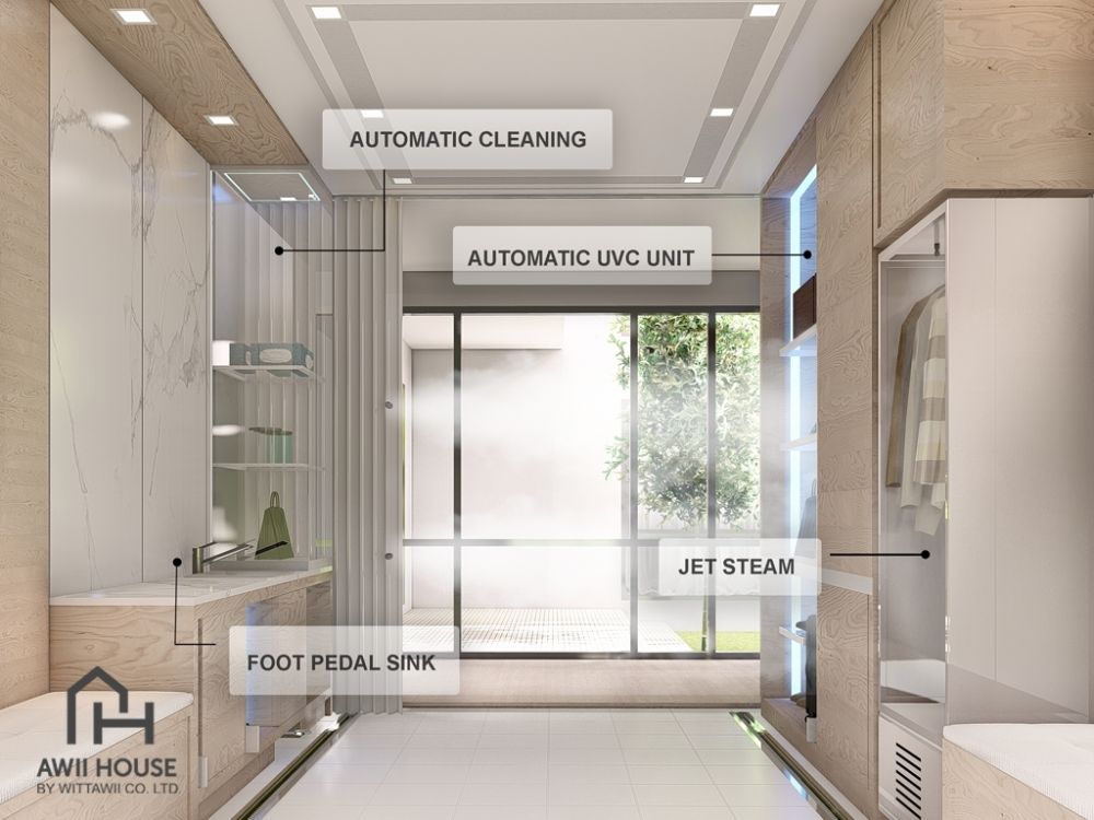 มีอ่างล้างมือแบบใช้เท้าเหยียบที่ถูกออกแบบให้ตอบรับกับเฟอร์นิเจอร์ และมีทางเข้าบ้านสำรอง เพื่อจะเดินไปถึงห้องน้ำและโซนซักล้างโดยตรง ในส่วนของอากาศภายในที่พักจะมีการติดตั้งนวัตกรรม Clean Air & Energy Recovery เพื่อช่วยลดกลิ่นอับ ไรฝุ่น ควบคุมความชื้นและอุณหภูมิภายในบ้าน มีตัวกรองอากาศแบบพิเศษ พร้อม UVC ฆ่าเชื้อ เพื่อกรองฝุ่นและละอองฝอยขนาดเล็ก อย่าง PM2.5 ไวรัส และแบคทีเรียร้าย ไม่ให้เล็ดลอดเข้ามา