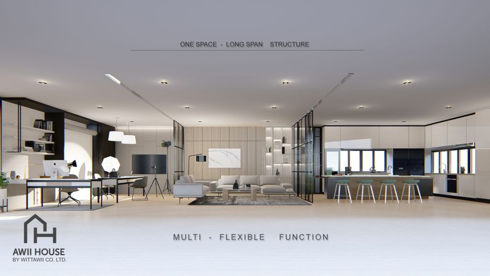 สร้างพื้นที่เป็นแบบ One Space ไม่มีเสาและผนังกั้น แต่จะเป็นแผงกั้นห้องที่เลือกเปิด-ปิดเฉพาะส่วน เก็บเสียงได้และสามารถเปลี่ยนบ้านเป็นมุมทำงานได้ เช่น กั้นห้อง Conference สำหรับการประชุม ห้องไลฟ์สด สำหรับขายของออนไลน์, ห้อง Streaming สำหรับ Caster Blogger และ Youtuber เป็นต้น