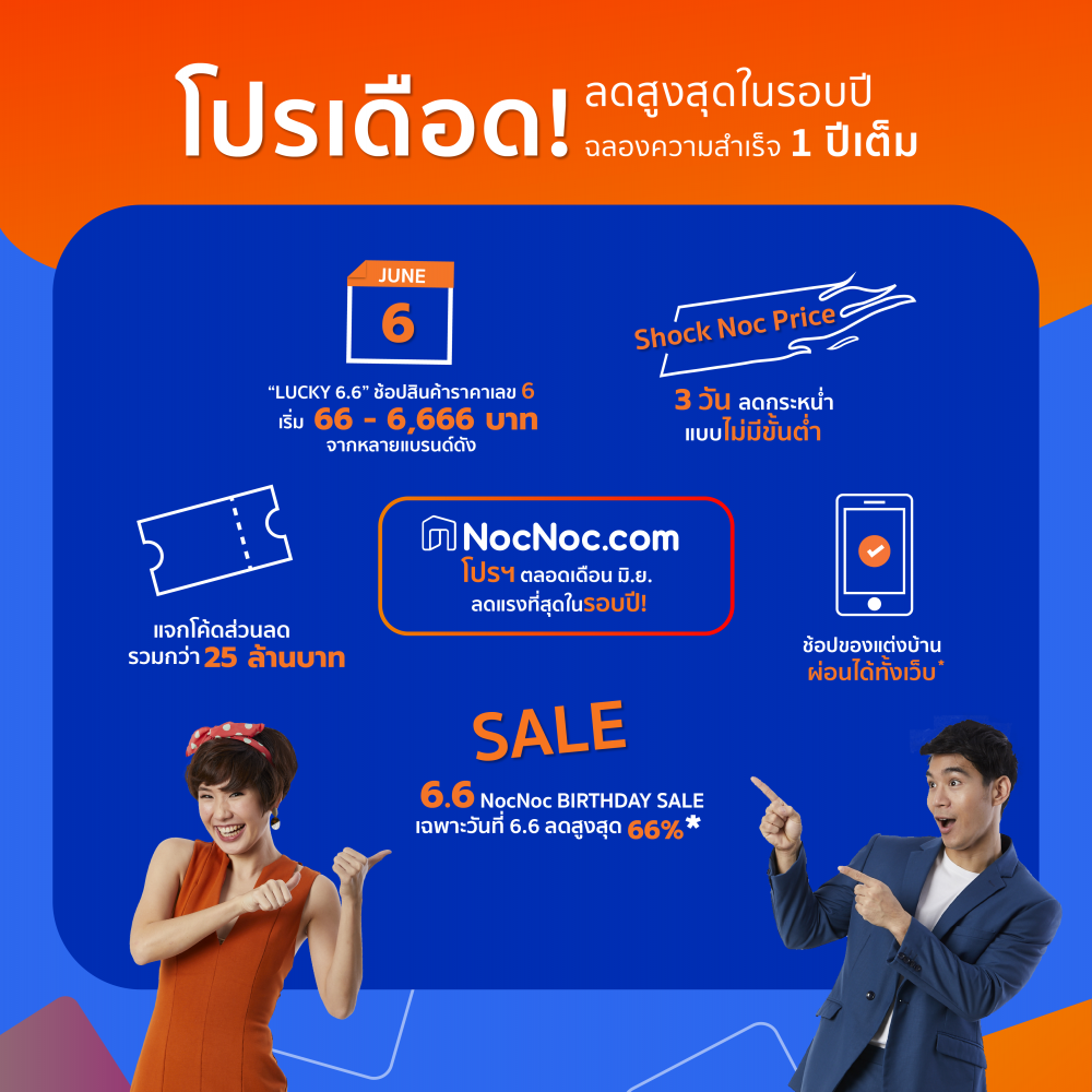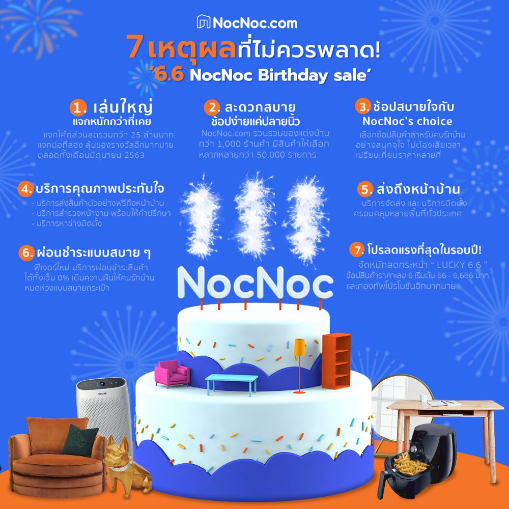 ลดต่อไม่รอแล้วนะ!! กลับมาสร้างความตื่นตาตื่นใจอย่างต่อเนื่อง พร้อมโปรดี ๆ ดีลเด็ดๆ อัดแน่นให้สมกับความสำเร็จ 1 ปีเต็ม กับ NocNoc.com เว็บไซต์ที่รวบรวมสินค้า-บริการด้านวัสดุก่อสร้างและสินค้าตกแต่งบ้านออนไลน์ที่ครบที่สุดรายแรกในไทย เปิดตัวแคมเปญ ‘6.6 NocNoc Birthday sale’