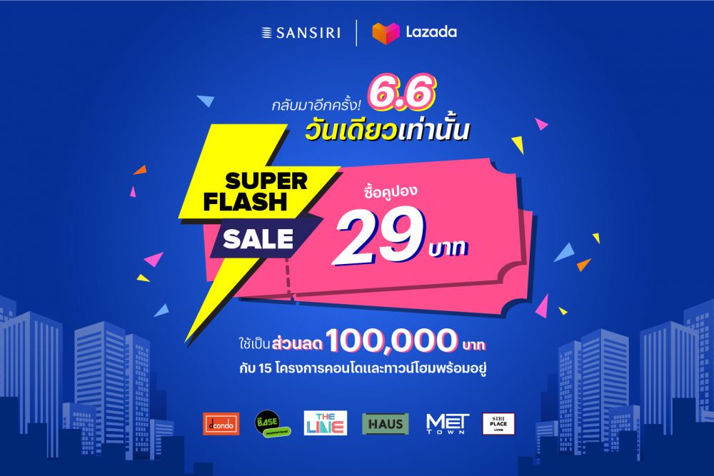แสนสิริพร้อมเดินหน้าสร้างความสุขเติมแต่งรอยยิ้มเอาใจลูกค้าฉลองวันพิเศษ วันที่ 6 เดือน 6 ด้วยโปรโมชั่นจากแสนสิริร่วมกับ Lazada ที่ลูกค้าสามารถจองคอนโดและทาวน์โฮมพร้อมอยู่จากแสนสิริพร้อมส่วนลด 100,000 บาท กับ Lazada SUPER FLASH SALE