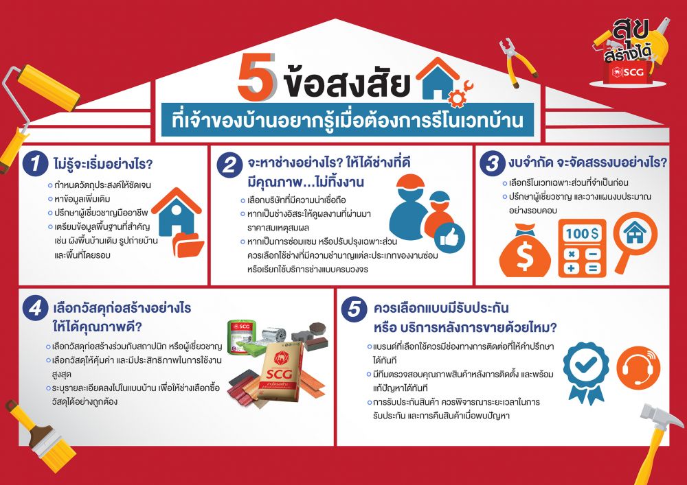 “เอสซีจี” ในฐานะผู้นำนวัตกรรมวัสดุก่อสร้างครบวงจร จึงได้รวบรวม 5 ข้อสงสัย ที่เจ้าของบ้านอยากรู้เมื่อต้องการรีโนเวทบ้าน พร้อมแนะนำทริคดีๆ ที่จะทำให้การรีโนเวทบ้านไม่วุ่นวาย ไม่มีปัญหากวนใจภายหลัง และได้บ้านที่ตรงใจมากที่สุด