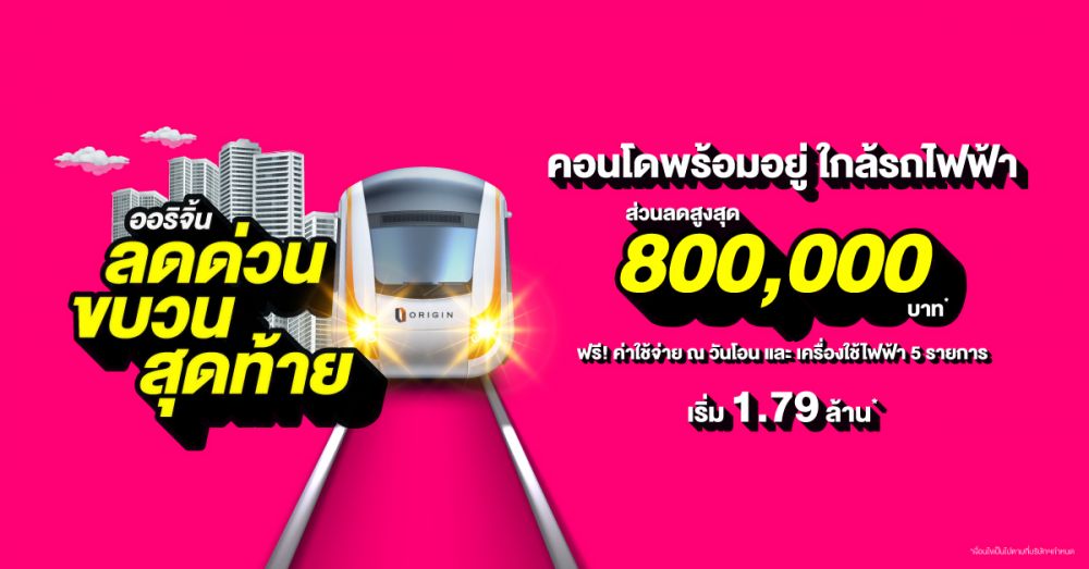 ฮอตปรอทแตก ออริจิ้น พร็อพเพอร์ตี้ จัดโปรร้อนแรงตลอดเดือนมิถุนายนกับแคมเปญ “ออริจิ้น ลดด่วน ขบวนสุดท้าย” ขนทัพ 10 คอนโดพร้อมอยู่ ใกล้รถไฟฟ้า หลากหลายทำเล ไม่ว่าจะเป็น ย่านสุขุมวิท พหลโยธิน ติวานนท์ สะพานใหม่ รวมถึงโซน EEC แหลมฉบัง-ศรีราชา ในราคาเริ่มต้นเพียง 1.79 ล้านบาท* มอบส่วนลดสูงสุด 800,000 บาท* พร้อมฟรี! ค่าใช้จ่าย ณ วันโอน และ ฟรี! เครื่องใช้ไฟฟ้า 5 รายการ