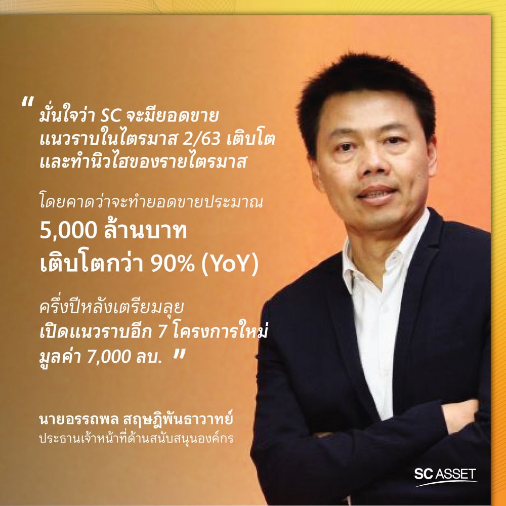 บริษัท เอสซี แอสเสท คอร์ปอเรชั่น จำกัด (มหาชน) หรือ SC ผู้พัฒนาสินค้าคุณภาพ และส่งมอบ living solutions เพื่อสร้างทุกเช้าที่ดีให้กับลูกค้าทุกคน โดยนายอรรถพล สฤษฎิพันธาวาทย์ ประธานเจ้าหน้าที่ด้านสนับสนุนองค์กร เปิดเผยว่า “ เรามั่นใจว่าบริษัทจะมียอดขายแนวราบในไตรมาส 2/63 เติบโตและทำนิวไฮของรายไตรมาส โดยคาดว่าจะทำยอดขายประมาณ 5,000 ล้านบาท เติบโตกว่า 90% (YoY)