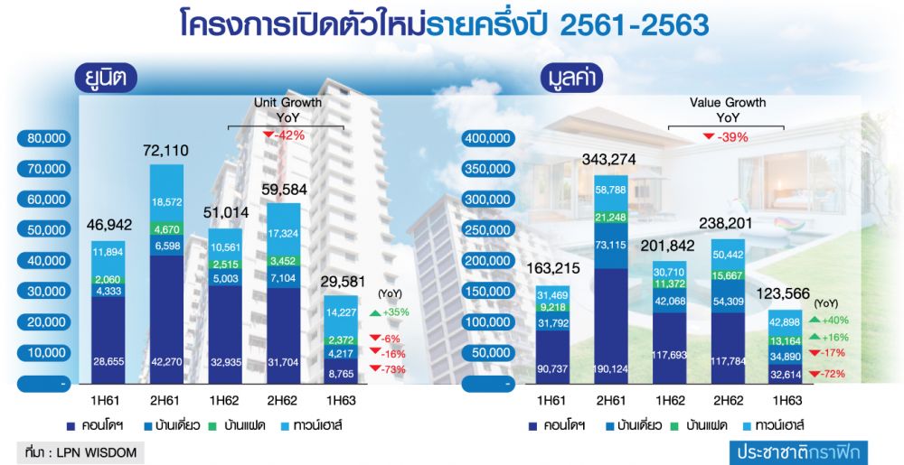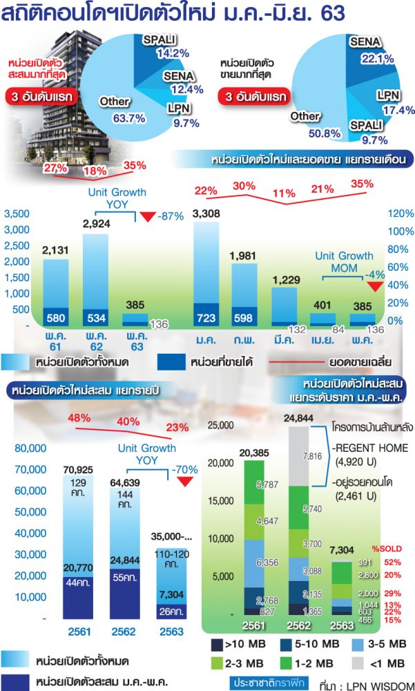 ล่าสุด “LWS-ลุมพินี วิสดอม แอนด์ โซลูชั่น” บริษัทลูกในเครือ LPN อัพเดตดาต้าเบสโครงการที่อยู่อาศัยแนวราบ แนวสูง ช่วงครึ่งปีแรก 2563 พื้นที่ กทม.-ปริมณฑล เริ่มจากภาพรวมพบว่า เดือนมกราคม-มิถุนายน 2562 มียอดเปิดตัวใหม่ 51,014 หน่วย มูลค่าเปิดตัว 201,842 ล้านบาท
