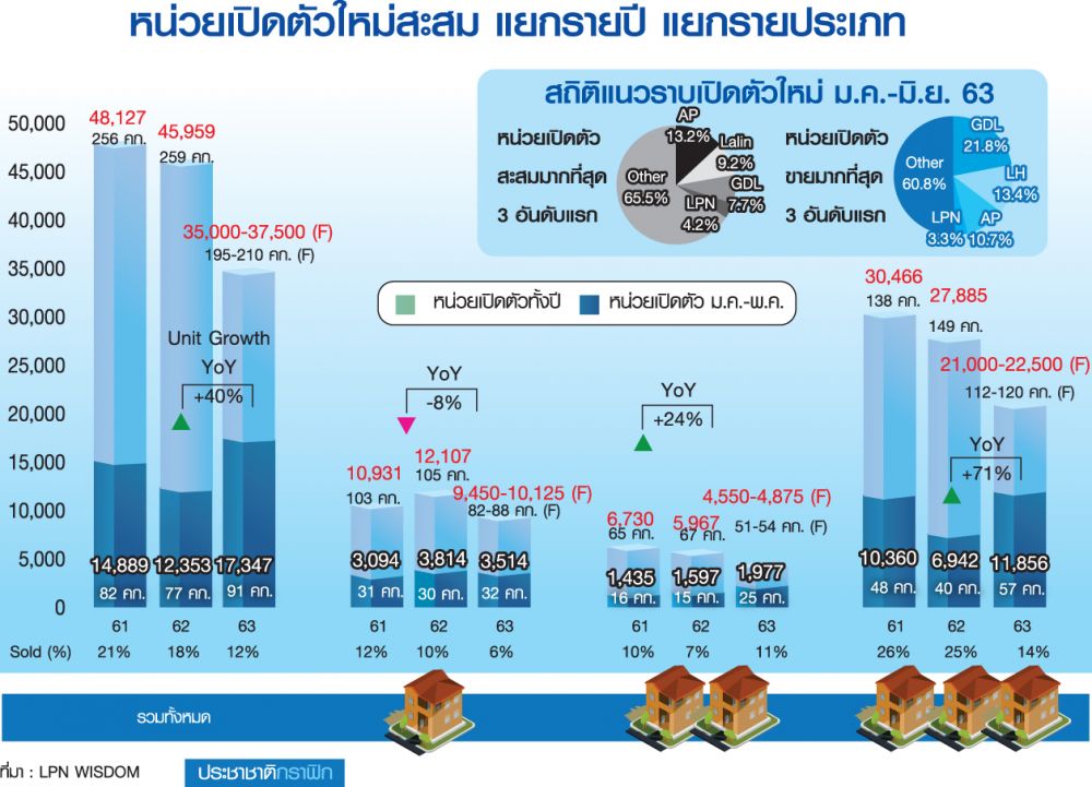 ส่องไส้ในสถิติรายไตรมาส พบว่า แนวราบช่วง 5 เดือนแรก 2563 มีการเปิดตัวใหม่ 17,347 หน่วย เติบโต 40% เทียบกับมกราคม-พฤษภาคม 2562 ที่มีการเปิดตัวใหม่ 12,353 หน่วย ในขณะที่คาดการณ์หน่วยเปิดตัวใหม่ปี 2563 อยู่ที่ 35,000-37,500 หน่วยเทียบกับการเปิดตัวใหม่ปี 2562 จำนวน 45,959 หน่วย เท่ากับประเมินว่าตลาดรวมสินค้าแนวราบ มีโอกาสติดลบ -19% จนถึง -24%