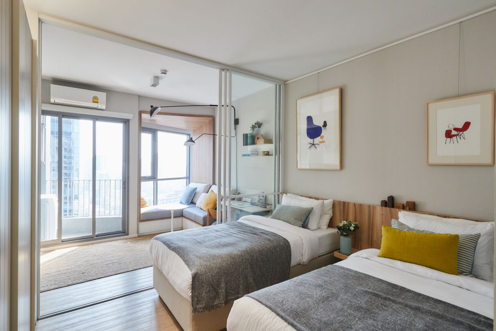 อาทิ แบบห้อง 1 ห้องนอน ขนาด 34 ตารางเมตร เมื่อเปิดห้องเข้ามาจะเจอพื้นที่ครัว ทางโครงการได้เตรียมเตียง Twin Beds บิ๊วท์-อิน ตู้เสื้อผ้า และมีเตียง Daybeds เพื่อนั่งเล่นชมวิวภายนอก พร้อมดีไซน์ระเบียงให้เอียงออกด้านนอก แม้จะหันหน้าเข้าอาคารสำนักงานก็สามารถรับมุมมองที่กว้างขึ้น