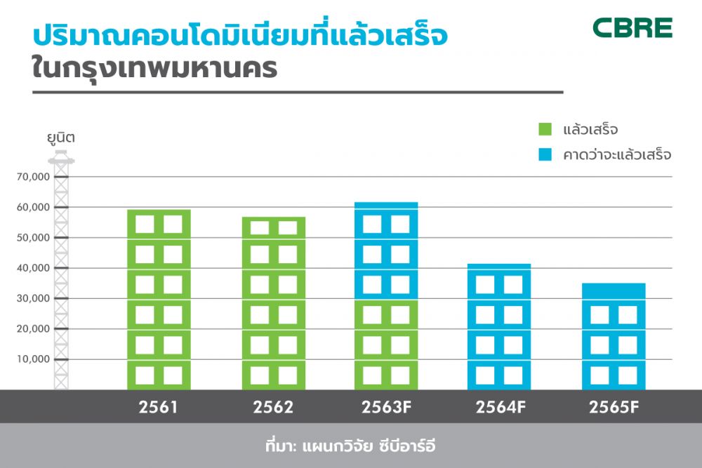 อย่างไรก็ตาม แม้ว่าสภาวะดังกล่าวจะดูเหมือนเป็นแนวโน้มที่ดีในการฟื้นตัวของตลาดคอนโดมิเนียมในกรุงเทพฯ แต่ปริมาณคอนโดมิเนียมใหม่ที่จะแล้วเสร็จและจะเข้าสู่ตลาดยังเป็นที่น่ากังวล ในปี 2563 จะมีคอนโดมิเนียมกว่า 60,000 ยูนิตที่คาดว่าจะแล้วเสร็จ และอีกประมาณ 80,000 ยูนิตจะแล้วเสร็จในปี 2564 – 2565