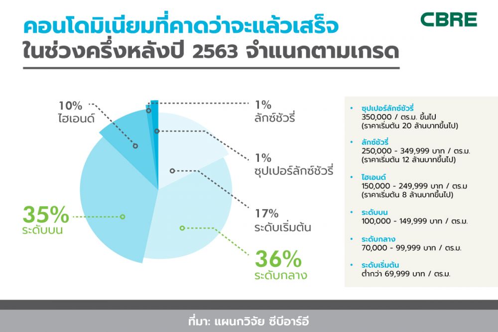 นายรัฐวัฒน์ คูวิจิตรสุวรรณ หัวหน้าแผนกวิจัยและที่ปรึกษาการพัฒนาโครงการ ซีบีอาร์อี ประเทศไทย กล่าวว่า “ในช่วงครึ่งแรกของปี 2563 ตลาดคอนโดมิเนียมในกรุงเทพมหานครชะลอตัว มีการเปิดตัวคอนโดมิเนียมไม่ถึง 10,000 ยูนิต