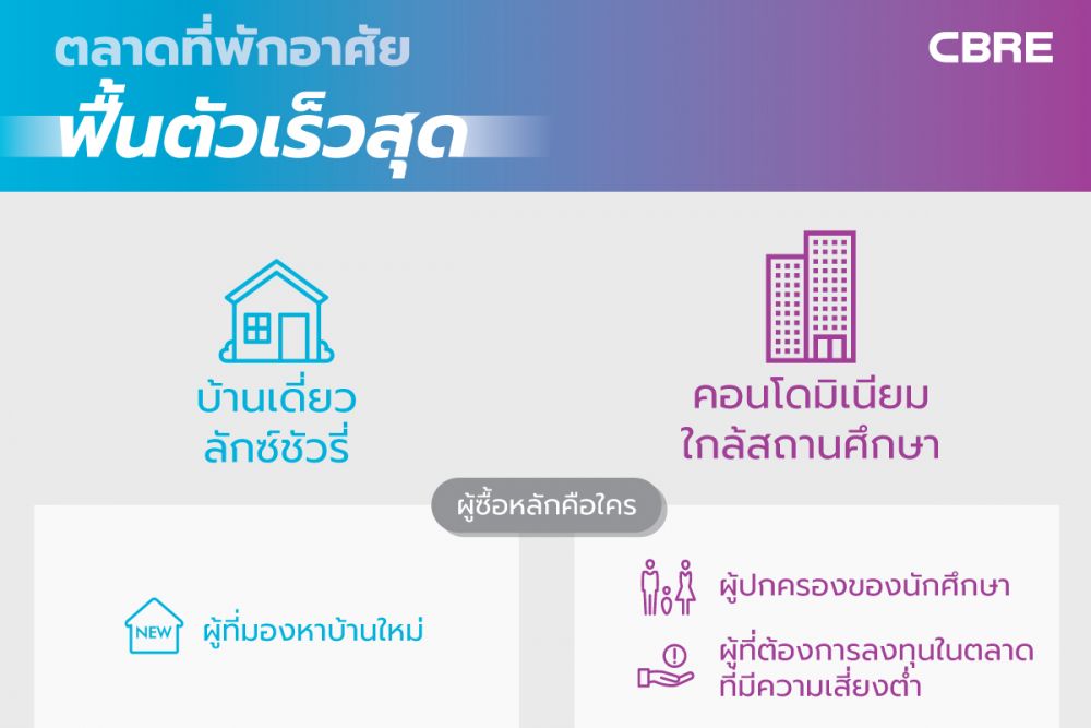 หลังจากภาครัฐมีมาตรการผ่อนปรนต่างๆ เพราะสถานการณ์การแพร่ระบาดของโรคโควิด-19 ในไทยเป็นไปในทิศทางที่ดีขึ้น ซีบีอาร์อี บริษัทที่ปรึกษาด้านอสังหาริมทรัพย์ชั้นนำ พบว่า ตลาดบ้านเดี่ยวระดับลักซ์ชัวรี่และตลาดคอนโดมิเนียมติดสถาบันการศึกษาได้รับความสนใจจากกลุ่มผู้ซื้อเป็นอย่างมาก ทำให้ทั้งสองตลาดนี้กลับมาฟื้นตัวก่อนตลาดอื่นๆ