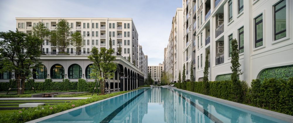 ตั้งแต่ซุ้มประตูทางเข้าคลับเฮ้าส์ดีไซน์โดดเด่นด้วยการเล่นมิติฟอร์มโค้งโปร่ง ก่อนเข้าสู่พื้นที่สวนสีเขียวสไตล์อังกฤษ (Courtyard) พร้อมต้นไม้ยืนต้นขนาดใหญ่ และสระว่ายน้ำยาวกว่า 50 เมตร ตอบโจทย์การอยู่อาศัยในคอนโดแบบโลว์ไรสที่มีดีไซน์โมเดิร์นและเน้นการอยู่ร่วมกันของธรรมชาติ ให้ความรู้สึกเหมือนการใช้ชีวิตในบ้านใจกลางเมือง