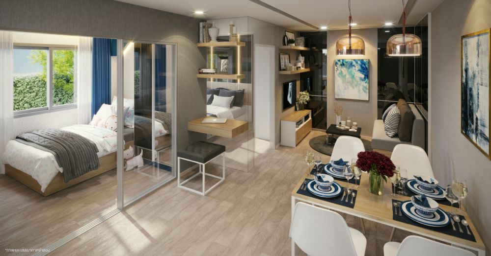 โดดเด่นในความแตกต่างของการดีไซน์และตอบสนองทุกความต้องการ ภายในห้องออกแบบฟังก์ชั่นกว้างขวางพร้อมเฟอร์นิเจอร์ครบชุด ตอบโจทย์การพักอาศัยอย่างแท้จริง กั้นห้องนอน ห้องรับแขก และห้องครัวเป็นสัดส่วนสามารถลิงค์กับไลฟ์สไตล์ได้ลงตัว