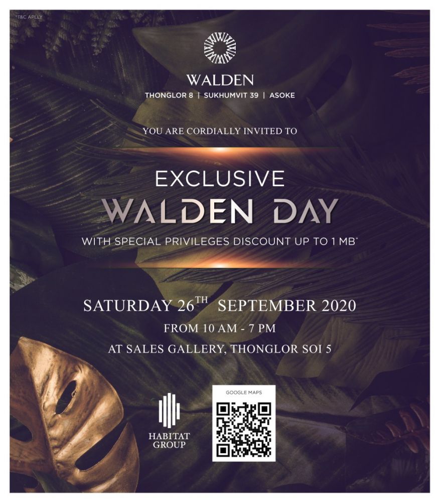 ฮาบิแทท กรุ๊ป จึงได้นำ 3 โครงการภายใต้แบรนด์ ‘วาลเด้น’ ใน 3 ทำเลซีบีดีศูนย์กลางธุรกิจทั้ง ทองหล่อ, สุขุมวิท 39 และอโศก ซึ่งเป็นทำเลตอบโจทย์การใช้ชีวิตของคนเมือง และครบทุกมิติการใช้ชีวิต ทำเลที่ตั้งที่สะดวกในการเดินทาง การทำงาน และ ไลฟ์สไตล์ของคนเมือง อีกทั้งเป็นย่านได้รับความนิยมซื้อเพื่ออยู่อาศัยและลงทุน มาจัดงาน “Exclusive Walden Day” ในวันเสาร์ที่ 26 กันยายนนี้ เพียงวันเดียวเท่านั้น