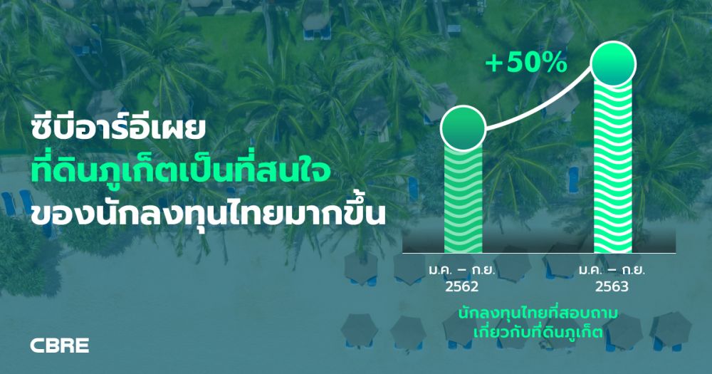 ในทางกลับกัน จากข้อมูลของแผนกการลงทุนและที่ดินแหล่งพักตากอากาศ ซีบีอาร์อี ภูเก็ต แสดงให้เห็นว่า ในช่วง 9 เดือนแรกของปี 2563 นักลงทุนไทยมีการติดต่อสอบถามและแสดงความสนใจที่ดินในภูเก็ตเพิ่มมากขึ้นถึง 50% เมื่อเทียบกับช่วงเดียวกันในปีก่อนหน้า โดย 62% ของการสอบถามมาจากผู้พัฒนาอสังหาริมทรัพย์ซึ่งส่วนใหญ่มองหาที่ดินเพื่อการพัฒนาโครงการใหม่ และผู้ซื้อรายย่อยที่มองหาที่ดินเพื่อสร้างบ้านพักตากอากาศส่วนตัว