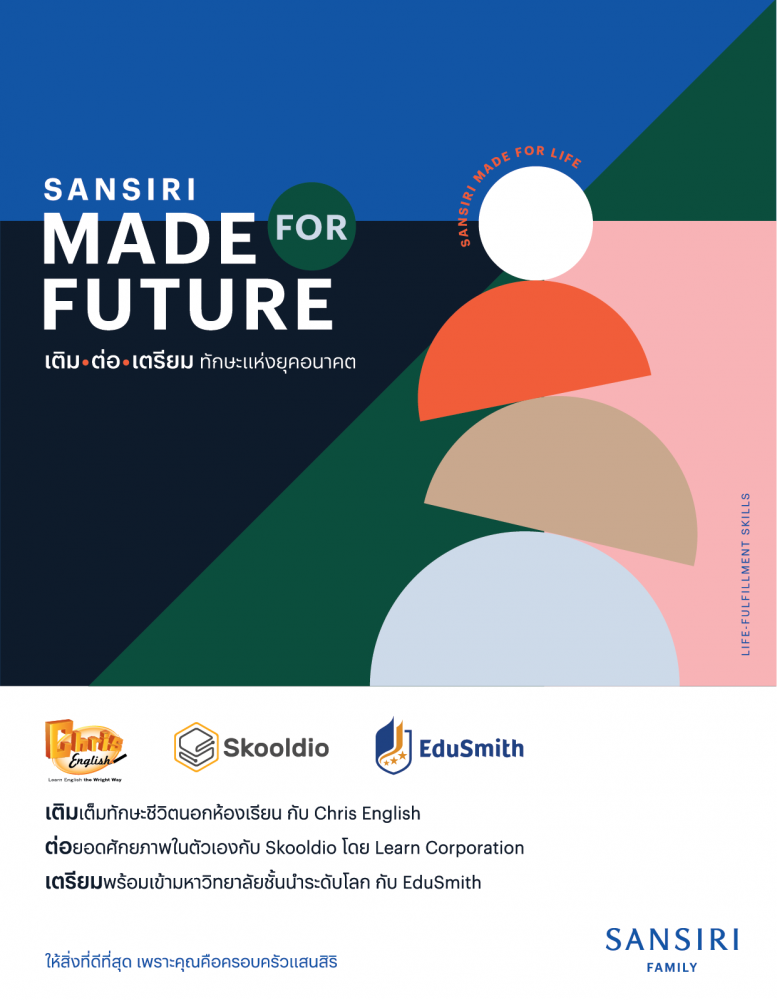 แคมเปญ “Sansiri Made for Future เติม-ต่อ-เตรียม ทักษะแห่งยุคอนาคต” นำเสนอในรูปแบบคอนเทนท์วีดีโอซีรีส์พิเศษ รายการเพื่อการศึกษาที่สนุกสนาน เข้าใจง่าย ได้สาระความรู้นอกจากห้องเรียน รวมถึง Infographic content เผยแพร่ผ่านช่องทาง โซเชียลมีเดียต่างๆ ของแสนสิริ ได้แก่ Facebook @SansiriFamily, YouTube @sansiriplc