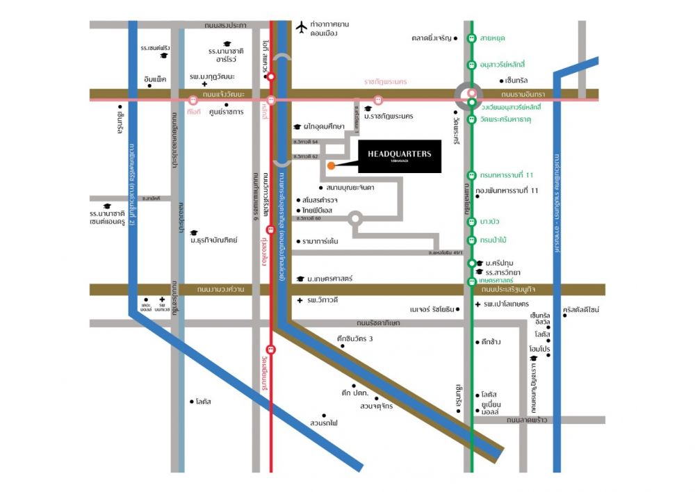 ที่ตั้งโครงการ HEADQUARTERS VIBHAVADI ถนนวิภาวดีรังสิต ซอย 62 โดยเข้าจากปากซอยเพียง 350 โครงกำรจะอยู่หัวมุมถนน 4 แยกด้านขวามือ สถานที่สำคัญใกล้เคียงต่างๆ เช่น เซ็นทรัล พลาซ่า ลาดพร้าว , เซ็นทรัล พลาซ่า แจ้งวัฒนะ , เซ็นทรัล พลาซ่า รามอินทรา , ใกล้มหาวิทยาลัยเกษตรศาสตร์, มหาวิทยาลัยศรีปทุม, มหาวิทยาลัยจันทร์เกษม , โรงเรียน นานาชาติ ISB , Harrow, St.Andrew , รพ.วิภาวดี , รพ.เปาโลเกษตร