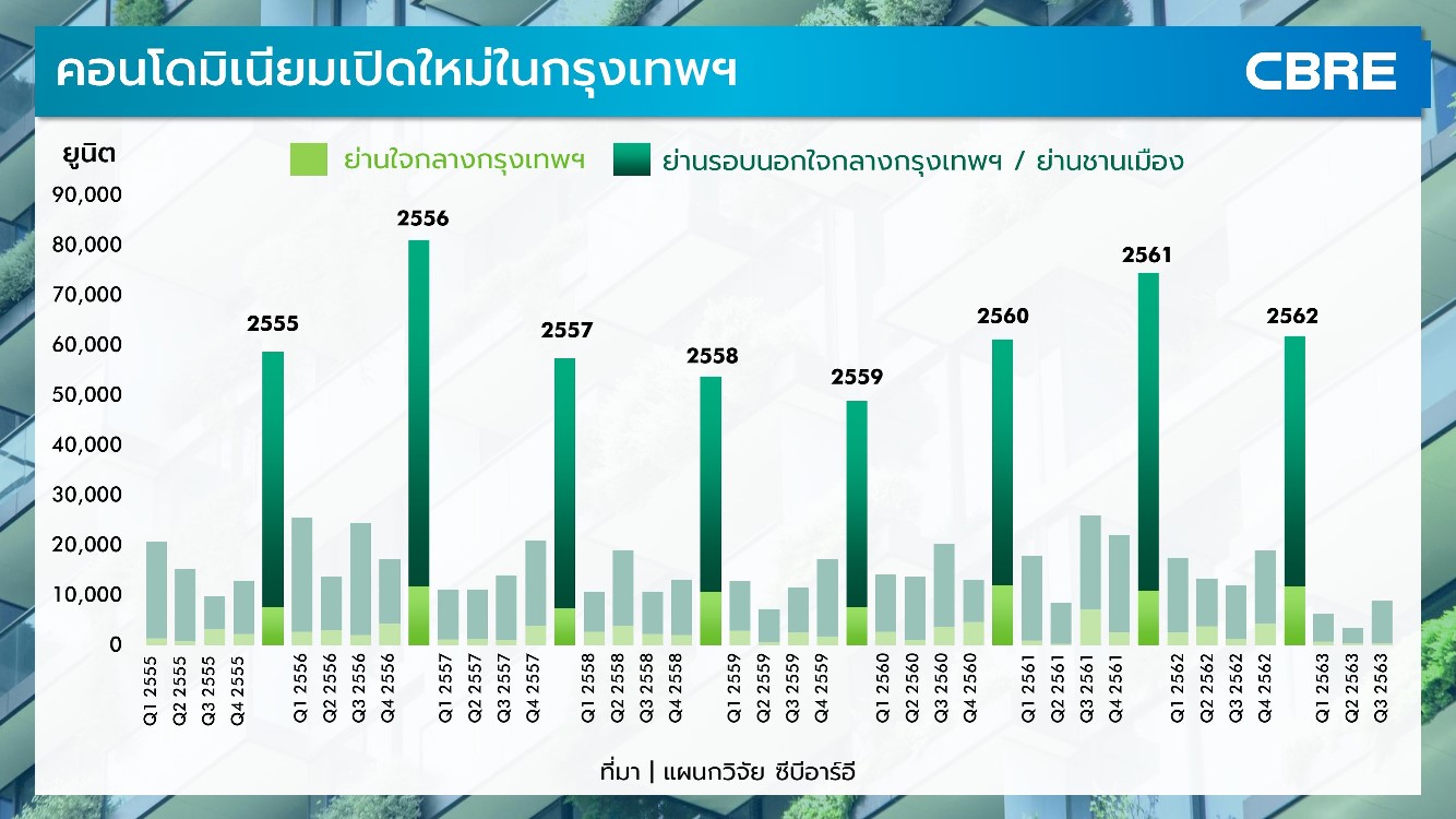 นายรัฐวัฒน์ คูวิจิตรสุวรรณ หัวหน้าแผนกวิจัยและที่ปรึกษาการพัฒนาโครงการ ซีบีอาร์อี ประเทศไทย เผยว่าปริมาณคอนโดมิเนียมที่เปิดตัวใหม่ในช่วง 9 เดือนแรกของปี 2563 ลดลงเหลือ 18,630 ยูนิต คิดเป็นลดลง 56.6% จากปีที่แล้ว เนื่องจากผู้พัฒนาโครงการได้มีการปรับกลยุทธ์ใหม่และมุ่งเน้นไปที่การสร้างรายได้แบบรวดเร็วเพื่อจัดการกับกระแสเงินสดในช่วงเวลาที่ท้าทายเช่นนี้ และยังพบว่ามีการลดราคาและการทำการส่งเสริมการขายสำหรับยูนิตเหลือขายที่พร้อมโอนกรรมสิทธิ์กันมากขึ้น โดยบางโครงการมีการลดราคากันถึง 20% - 25%