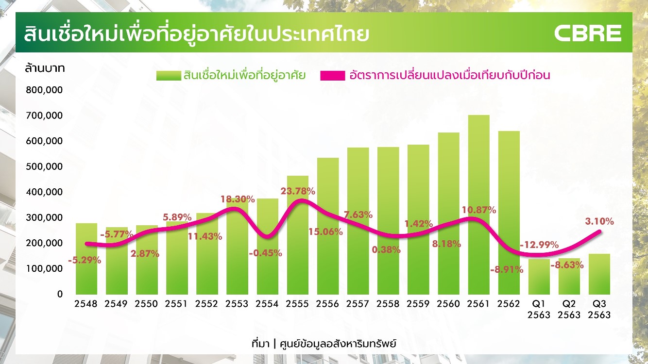 ในด้านสินเชื่อเพื่อที่อยู่อาศัย แผนกวิจัย ซีบีอาร์อีพบว่าในไตรมาส 3 ปี 2563 สินเชื่อใหม่เพื่อที่อยู่อาศัยกลับมามีปริมาณเพิ่มขึ้น 12.7% จากไตรมาสก่อนหน้าและเพิ่มขึ้น 3.1% หากเทียบกับช่วงเดียวกันของปีก่อน แม้ว่าสินเชื่อดังกล่าวอาจจะมาจากความต้องการสะสมก่อนที่จะคลายมาตรการล็อคดาวน์ แต่ก็เป็นสัญญาณที่ดีที่ชี้ให้เห็นว่ายังคงมีความต้องการอยู่ในตลาด