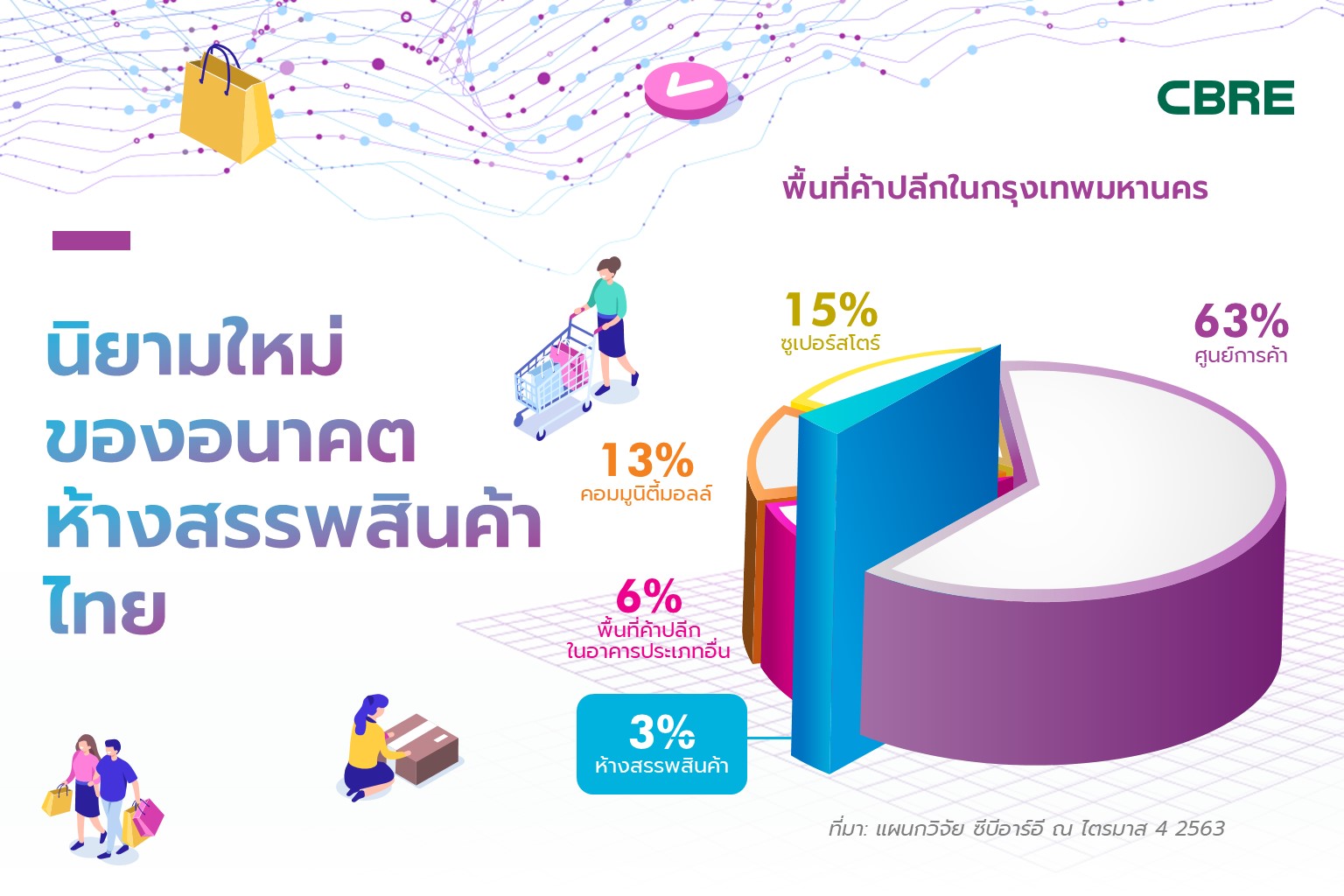 แม้ว่าห้างสรรพสินค้าจะเป็นสถานที่ที่คนไทยคุ้นเคยกันมานานหลายสิบปี แต่ ซีบีอาร์อี บริษัทที่ปรึกษาด้านอสังหาริมทรัพย์ชั้นนำ ได้เห็นถึงความนิยมที่ลดลงและมีการเติบโตเพียงเล็กน้อย โดยเฉพาะในปี 2563 ที่โควิด-19 ส่งผลกระทบโดยตรงต่อธุรกิจค้าปลีก