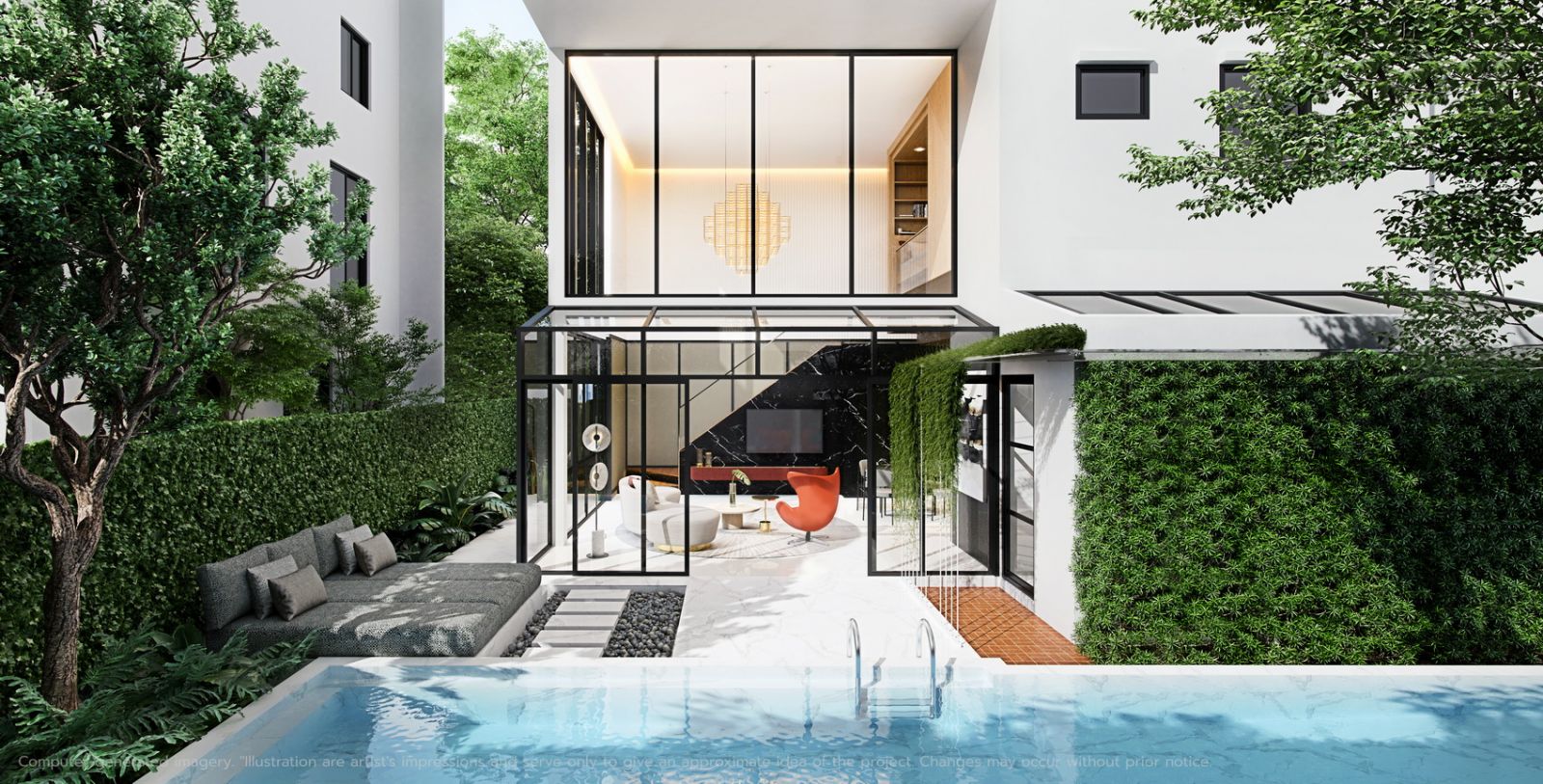 นายณัฐพล กล่าวอีกว่า ด้วยวิถีชีวิตที่เปลี่ยนไปทำให้ผู้คนต้องอาศัยหรือทำงานในบ้านมากขึ้น บริษัทจึงวางแนวคิดหลักในการดีไซน์ให้เน้นความรู้สึกโปร่งโล่งสบายให้กับผู้อยู่อาศัย อย่าง Double Volume Living Room ผนังกระจกสูงกว่า 6 เมตร เปิดรับแสงสว่างจากธรรมชาติเข้าสู่ตัวบ้าน สามารถมองเห็นวิวสวนได้อย่างเต็มที่ ทั้งยังสามารถเป็นพื้นที่ทำกิจกรรมร่วมกันของคนในครอบครัว ตัว Façade ด้านนอก เพิ่มความรู้สึกอบอุ่นด้วยการใช้วัสดุไม้เทียมสีอ่อน ช่วยให้กลืนไปกับพื้นที่สีเขียวภายในบริเวณบ้านอย่างลงตัว
