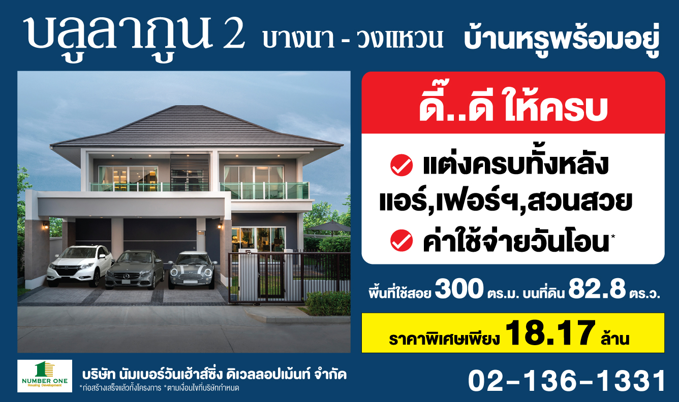 บริษัท นัมเบอร์วันเฮ้าส์ซิ่ง ดิเวลลอปเม้นท์ จำกัด ผู้พัฒนาอสังหาริมทรัพย์คุณภาพโครงการบลูลากูน 2 บางนา – วงแหวน บ้านหรูในสังคมคุณภาพ สร้างขึ้นจากแนวคิดที่ต้องการให้ผู้พักอาศัยมีความสุขทุกวัน เพื่อให้ทุกวันของคุณเป็นดั่งวันหยุดพักผ่อนที่แท้จริง