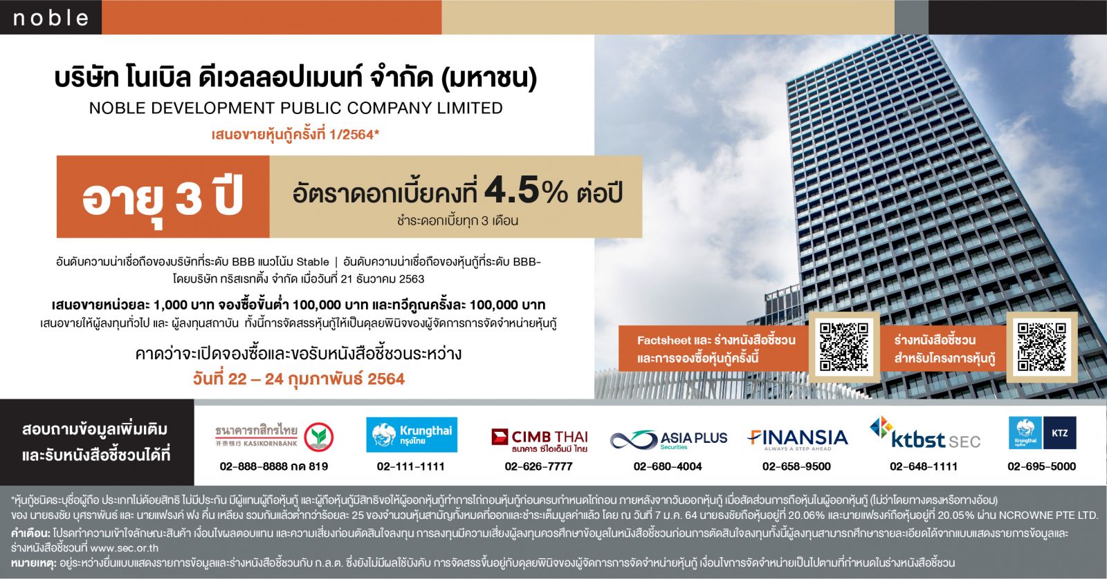 สำหรับผู้ลงทุนที่ต้องการข้อมูลเพิ่มเติมเกี่ยวกับการเสนอขายหุ้นกู้ของ NOBLE สามารถติดตามรายละเอียดได้ที่ www.sec.or.th หรือ https://investor.noblehome.com และสามารถติดต่อสถาบันการเงินได้ดังต่อไปนี้