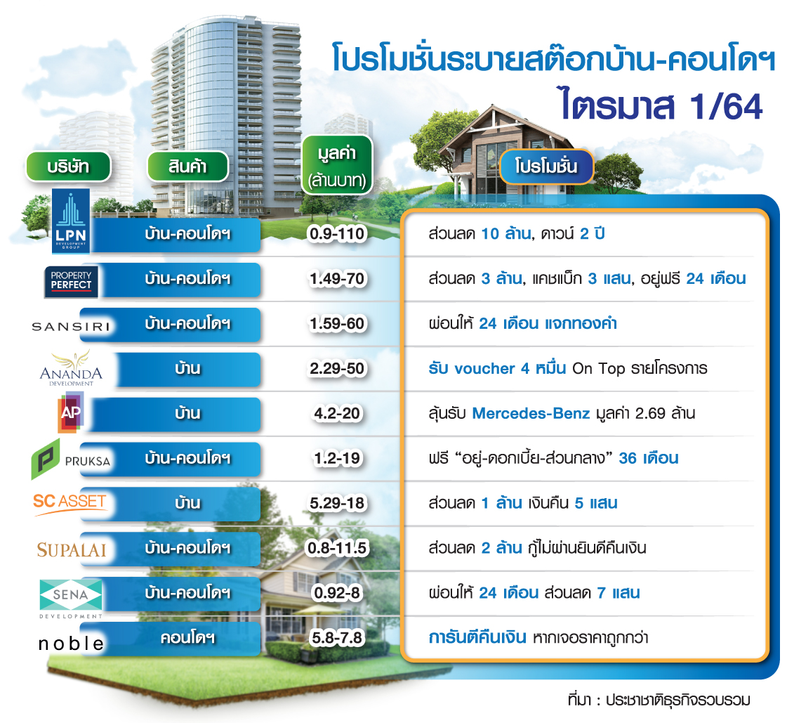 มาตรการรัฐลดค่าโอน-จำนองไม่เกิน 3 ล้านกระสุนด้าน ศูนย์ข้อมูลอสังหาฯส่องไตรมาส 1/64 ประเมินหน่วยโอนทั่วประเทศติดลบ -10% พื้นที่ กทม.พ่วงปริมณฑลติดลบ -7% บิ๊กแบรนด์เข็นโปรโมชั่นผ่อนให้ 24 เดือนล้นตลาด “พฤกษา” อยู่ฟรี 36 เดือน “LPN” ขนสต๊อกสร้างเสร็จดึงลูกค้าอาชีพอิสระอยู่ก่อนโอน 2 ปี “เอพี ไทยแลนด์” ให้ลุ้นรถเบนซ์ซี-คลาส