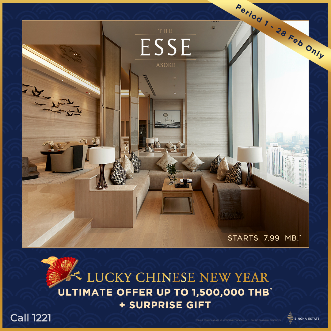 สิงห์ เอสเตท มอบโปรโมชั่นพร้อมเข้าอยู่สุดพิเศษต้อนรับเทศกาลตรุษจีน สำหรับคอนโดมิเนียมลักชัวรีแบรนด์ The ESSE ใน 3 ทำเลใจกลางเมืองคือ The ESSE Sukhumvit 36 (ดิ เอส สุขุมวิท 36) The ESSE Asoke (ดิ เอส อโศก) และ The ESSE at Singha Complex (ดิ เอส แอท สิงห์ คอมเพล็กซ์) ด้วยข้อเสนอพิเศษสูงสุดถึง 2 ล้านบาท ตั้งแต่วันนี้ - 28 กุมภาพันธ์ ศกนี้