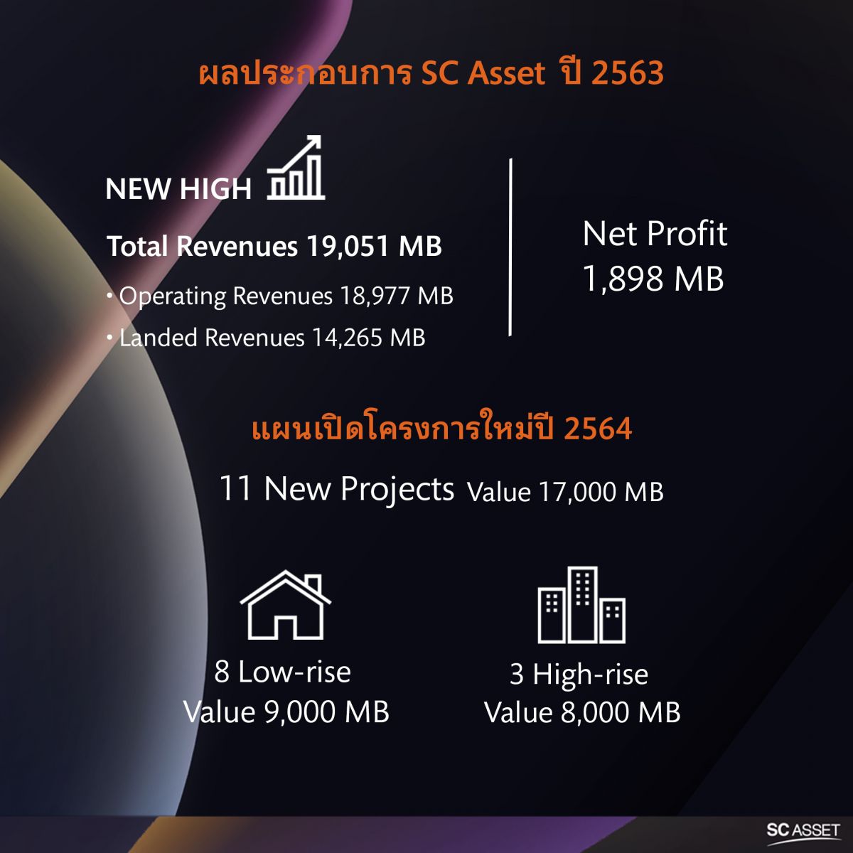 นายอรรถพล กล่าวสรุปว่า “ ด้วยความเชื่อมั่นของลูกค้าและพันธมิตรทางธุรกิจ ประกอบกับความพร้อมในทุกด้านของ SC มั่นใจว่า ปี 2564 บริษัทจะประสบความสำเร็จเติบโตทั้งยอดขายและรายได้เช่นที่ผ่านมา โดยมาจากทั้งพอร์ตหลักของแนวราบทุกระดับราคา จำนวน 58 โครงการ มูลค่าโครงการ 36,900 ล้านบาท และโครงการแนวสูง 11 โครงการ มูลค่าโครงการ 20,600 ล้านบาท ”