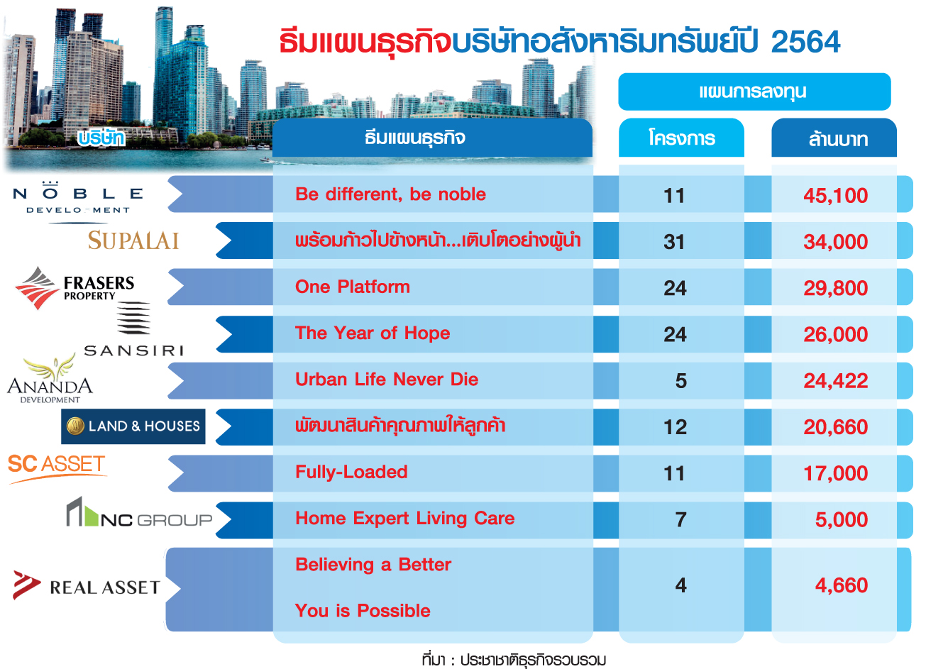 ไตรมาส 1/64 อสังหาฯจุดพลุเรียกความเชื่อมั่น สำรวจ 9 บริษัทพร้อมใจลงทุนใหม่ 206,642 ล้าน “อนันดาฯ” นำบ้าน-คอนโดฯ 26 โครงการพร้อมอยู่ทุบโปรโมชั่นผ่อนให้ 36 เดือน “โนเบิลฯ-แสนสิริ-ศุภาลัย-เอสซีฯ-แลนด์ฯ-NC-เรียลแอสเสทฯ” กางแผนธุรกิจโฟกัสเซ็กเมนต์ถนัดเจาะกำลังซื้อเรียลดีมานด์-นักลงทุน