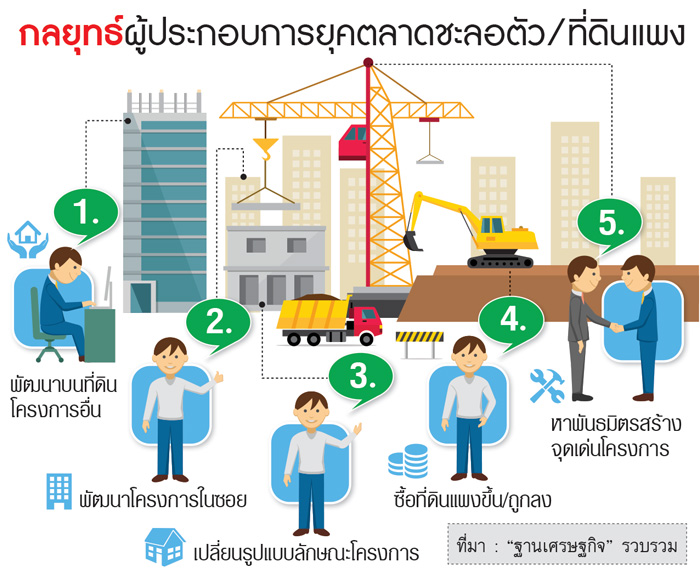 บริษัทที่ปรึกษาอสังหาฯ เปิดกลยุทธ์ผู้ประกอบการยุคราคาที่ดินแพง ตลาดชะลอตัวซีบีอาร์อี เผยพัฒนาโครงการใหม่ในที่ดินของผู้ประกอบการรายอื่นช่วยเพิ่มความน่าสนใจให้โครงการ ด้าน“เซ็นจูรี่ 21” ดีเวลอปเปอร์ที่เคยซื้อที่ดินแพงริมถนนหันเข้าซอยพัฒนาโครงการหรู ขณะที่ดีเวลอปเปอร์เคยซื้อที่ดินถูกเบนเข็มซื้อที่ดินแพง กูรูอสังหาฯ ชี้เป็นเทรนด์ตลาดที่มีความชัดเจนมากขึ้น ล่าสุด เจ.เอส.พี.จับมือแม็คโครเปิด “แม็คโคร ฟูดเซอร์วิส” สาขาไมอามี หวังเป็นแลนด์มาร์กย่านบางปู