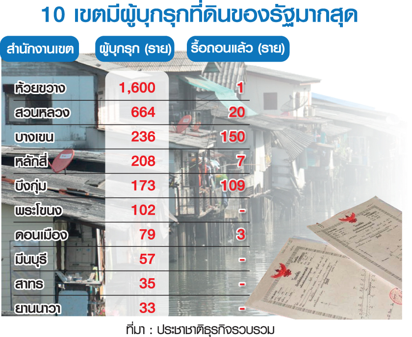 ล่าสุด “สำนักเทศกิจ” ได้รวบรวมผู้บุกรุกที่ดินรัฐ พบว่า มียอดผู้บุกรุกอยู่ที่ 3,403 รายใน 32 เขต ได้แก่ เขตสาทร จำนวน 35 ราย บางนา จำนวน 1 ราย สวนหลวง จำนวน 664 ราย พญาไท จำนวน 2 ราย