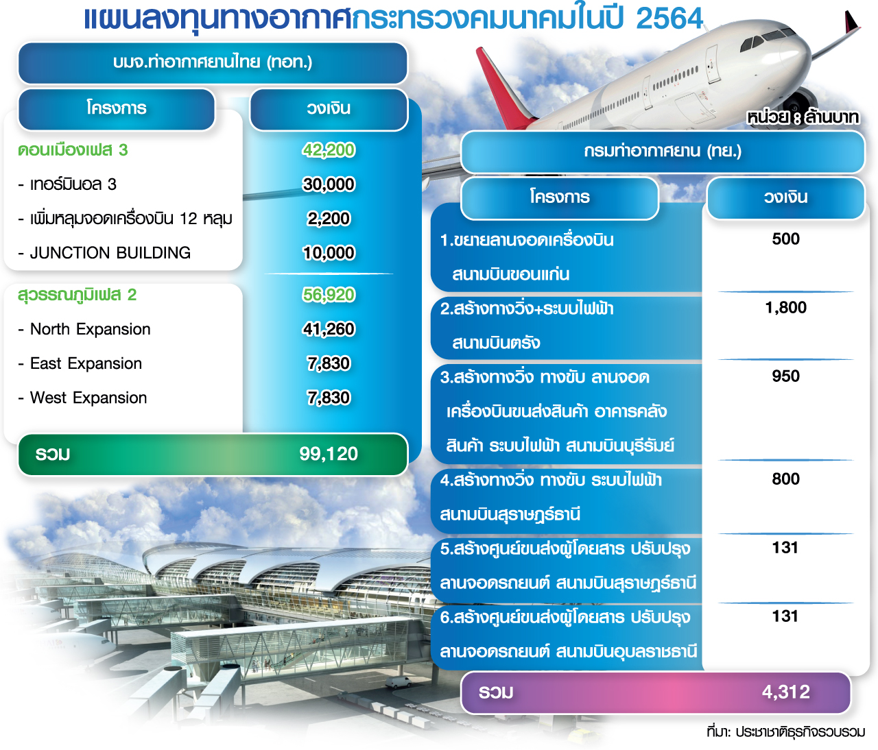 “ทอท.” เปิดแผนลงทุนแสนล้าน พลิกโฉมสนามบิน รับท่องเที่ยว-การบินฟื้น ปีนี้เปิดประมูลอาคารผู้โดยสารหลังที่ 3 ดอนเมือง ผุดหลุมจอด อาคารจังก์ชั่น ฝ่าแรงต้าน “สุวรรณภูมิ เฟส 2” ทุ่มสร้างเทอร์มินอลใหม่ด้านเหนือ ขยายปีกอาคารหลังเดิมด้านตะวันออก-ตะวันตก รองรับผู้โดยสารในประเทศและอินเตอร์ เบรกอาคารด้านทิศใต้ รื้อรถไฟฟ้า APM ผุดสถานีไฮสปีดแทน ชง ครม.เคาะแผนใหม่กลางปี’64 กรมท่าฯทุ่ม 4.3 พันล้านยกเครื่องสนามบินขอนแก่น ตรัง บุรีรัมย์ สุราษฎร์ธานี อุบลราชธานี