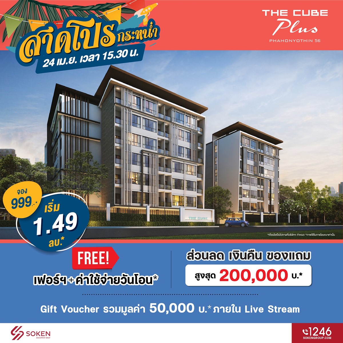The Cube Plus Phahonyothin 56 (เดอะคิวบ์ พลัส พหลโยธิน 56) คอนโดมิเนียมใหม่สไตล์โมเดิร์นโลว์ไรส์ (Low Rise) สูง 7 ชั้น พร้อมโอนกรรมสิทธิ์และพร้อมเข้าอยู่ได้ทันที บนทำเลศักยภาพใกล้รถไฟฟ้า BTS สายสีเขียว สถานีแยก คปอ. กองทัพอากาศ โรงเรียนนายเรืออากาศ สนามบินดอนเมือง จัดโปรโมชันผ่านกิจกรรม Soken Live Stream ‘สาดโปรกระหน่ำ’ รวมมูลค่า 2 แสนบาท* ราคาเริ่มต้น 1.49 ล้านบาท*