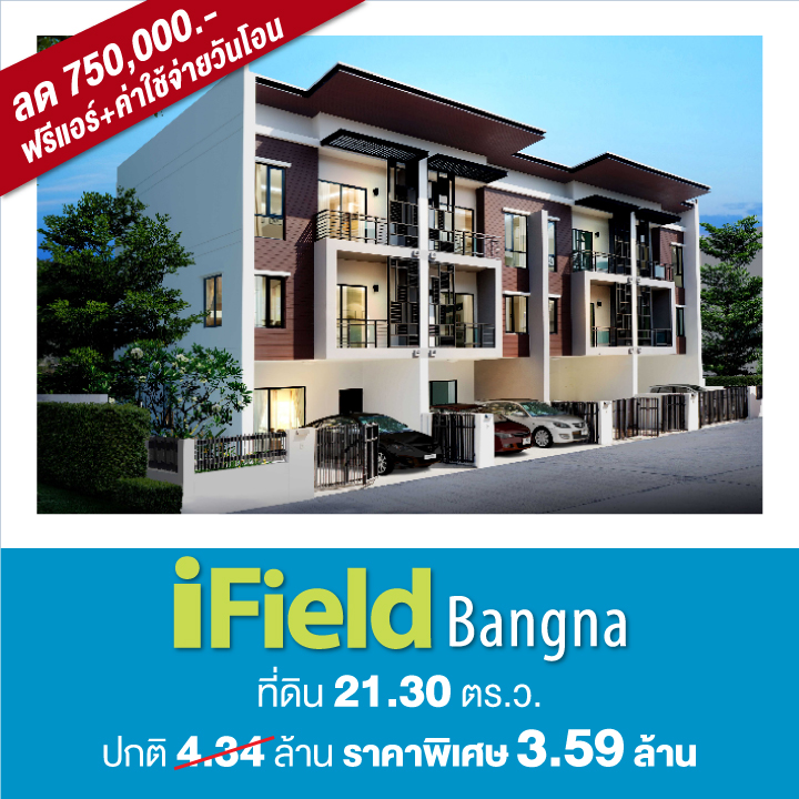 พร้อมคลับเฮ้าส์หรูและสวนสวยที่กระจายตัวทั่วโครงการ ในราคาพิเศษเพียง 3.59 ล้านบาท (จากราคาปกติ 4.34 ล้านบาท) พิเศษ!! แถมแอร์ 3 ห้องนอน, ฟรีค่าใช้จ่ายวันโอน, ฟรีค่าส่วนกลางนาน 2 ปี, ฟรีค่ามิเตอร์น้ำไฟ ลงทะเบียนรับสิทธิ์ที่ https://www.ifieldbangna.com/ หรือสอบถามรายละเอียดเพิ่มเติมโทร 02-136-2828