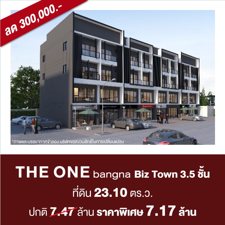 พร้อมแนะนำโครงการใหม่ ตอบโจทย์นักลงทุนที่มองหาบิสทาวน์และโฮมออฟฟิศพร้อมทำธุรกิจและพักอาศัยด้วยกำลังซื้อที่รองรับจำนวนมากตั้งอยู่บนทำเลศักยภาพหน้าโรงเรียนสาธิตมหาวิทยาลัยรามคำแหง 2 ที่เติบโตทุกปี กับโครงการ THE ONE bangna Biz Town 3.5 ชั้น พื้นที่ใช้สอย 220 ตร.ม. บนที่ดิน 23.10 ตร.ว. ราคาพิเศษ 7.17 ล้านบาท (จากราคาปกติ 7.47 ล้านบาท) พร้อมเพิ่มโอกาสทางธุรกิจด้วยที่จอดรถส่วนกลางสำหรับรองรับลูกค้า