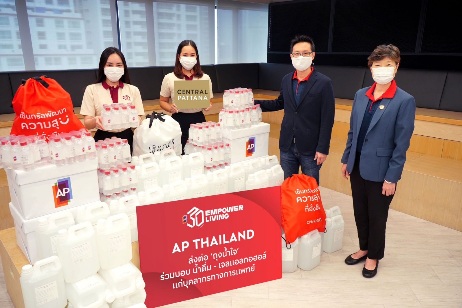 ส่งมอบน้ำดื่มเอพี 4,200 ขวด และเจลแอลกอฮอล์ปริมาณ 500 ลิตร ในโครงการ ALL FOR HEROES ที่จัดต่อเนื่องเป็นปีที่สอง เพื่อส่งต่อถุงน้ำใจ พร้อมพลังบวกและกำลังใจ ให้แก่ทีมบุคลากรทางการแพทย์ฮีโร่ด่านหน้าของประเทศไทย ในการสู้วิกฤตโควิด-19 ระลอกใหม่แก่ 7 โรงพยาบาลรัฐและโรงพยาบาลสนามในการดูแลผู้ป่วย และเป็นส่วนหนึ่งของการเอ็มพาวเวอร์ให้ประเทศไทยของเราผ่านพ้นวิกฤตการณ์แพร่ระบาดโควิด-19 ไปด้วยกัน ณ เอพี ไทยแลนด์ สำนักงานใหญ่
