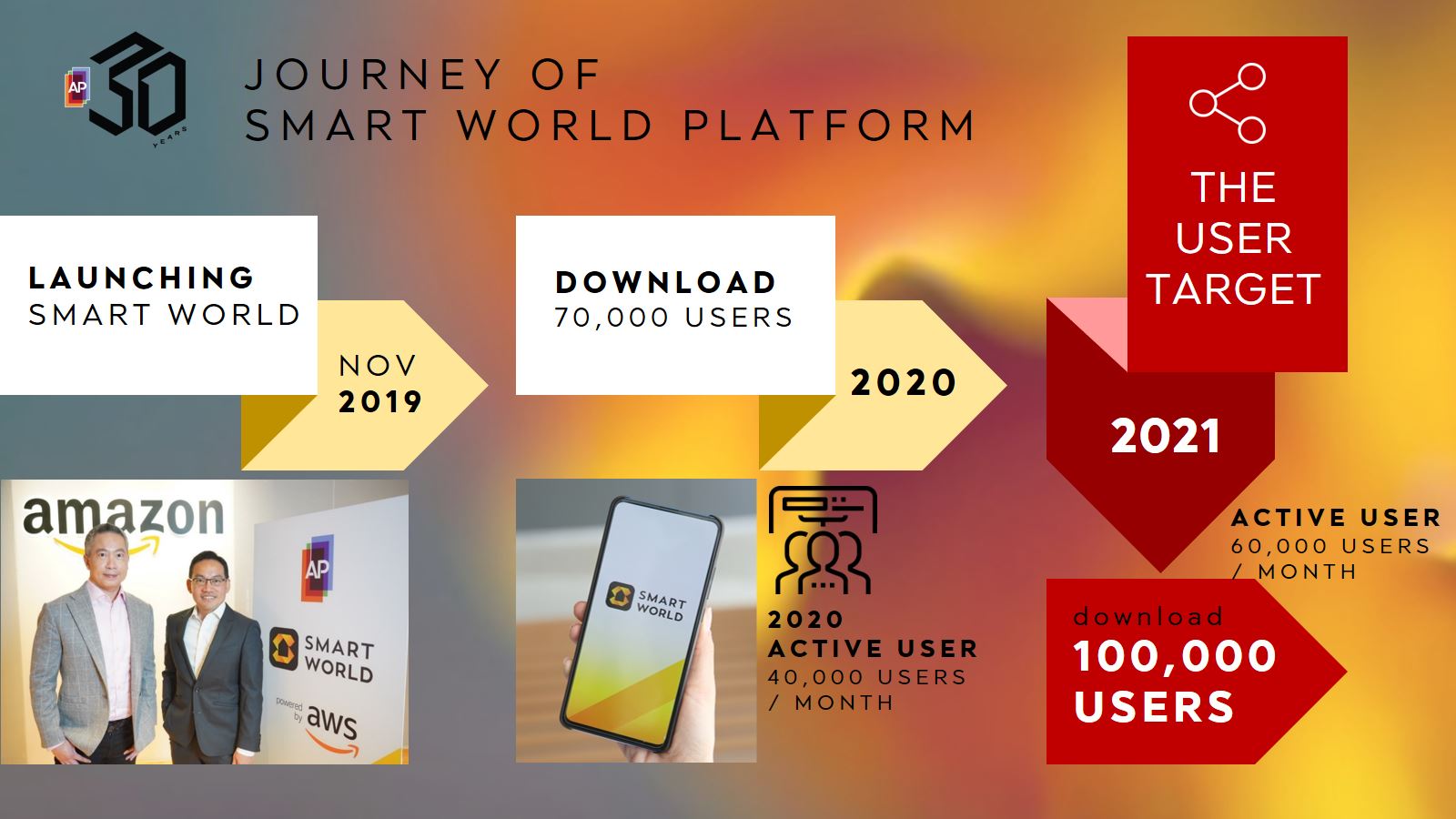 บริษัทฯ จึงพัฒนา SMART WORLD ขึ้นบนพื้นฐานในการทำความเข้าใจถึงความต้องการแฝง (unmet need) ที่ซ่อนอยู่ของลูกค้า ภายใต้เป้าหมายสำคัญที่ต้องการให้ SMART WORLD เป็นผู้ช่วยที่ส่งเสริมให้การดำเนินชีวิตประจำวันของลูกบ้านมีความคล่องตัวและสะดวกสบายสูงสุด  ซึ่ง ณ สิ้นปี 2020 SMART WORLD มียอดดาวน์โหลดแล้วมากถึง 70,000 ยูสเซอร์ มียอดผู้ใช้งาน (Active User) เฉลี่ย 40,000 ยูสเซอร์ต่อเดือน โดยในปี 2021 นี้บริษัทฯ ตั้งเป้ายอดดาวน์โหลดสะสมที่จำนวน 100,000 ยูสเซอร์ และยอดผู้ใช้งาน (Active User) เฉลี่ย 60,000 ยูสเซอร์ต่อเดือน