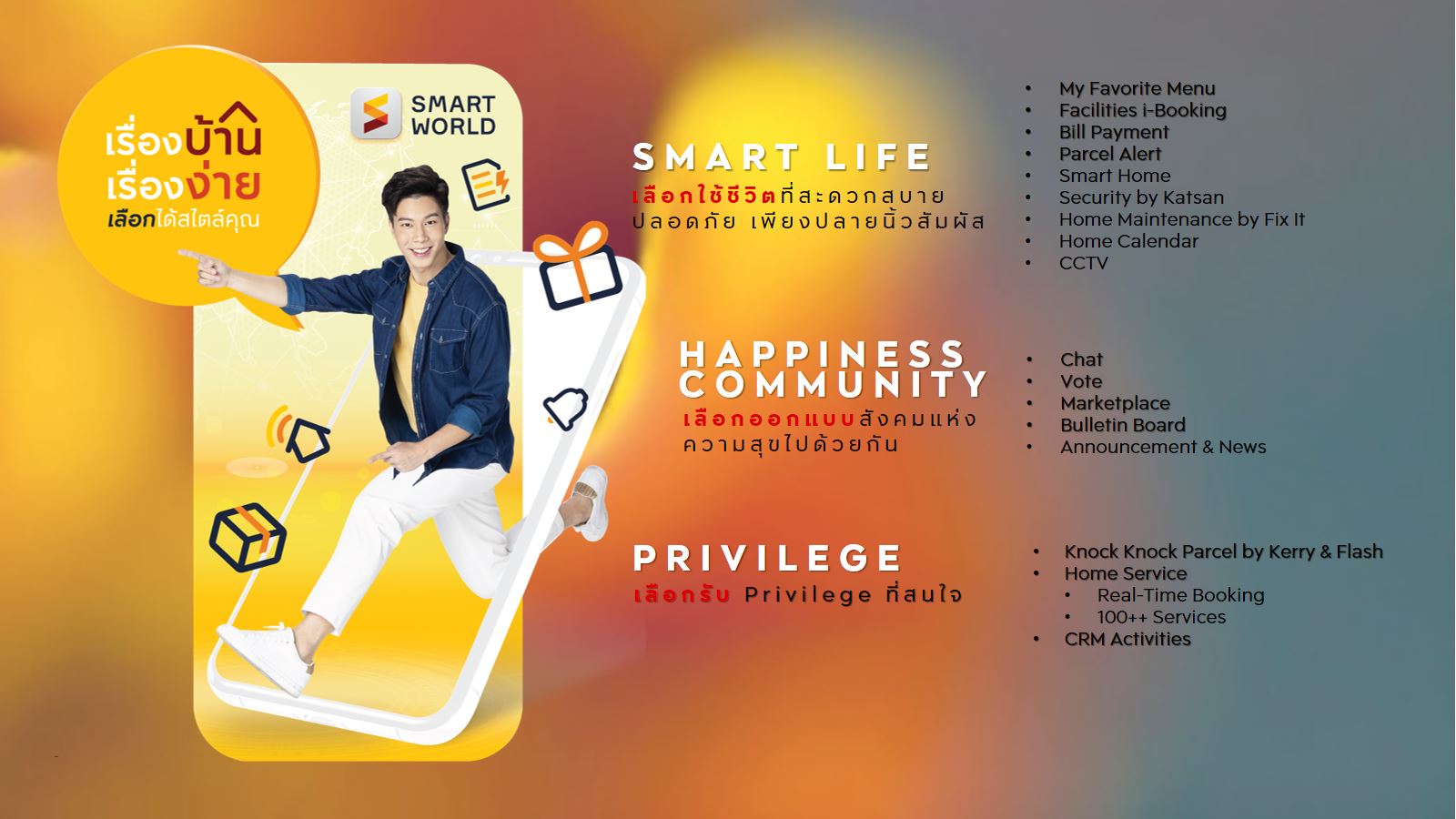 SMART WORLD คือ ดิจิทัลแพลตฟอร์มบริหารคุณภาพชีวิตหลังการเข้าอยู่อาศัยในโครงการอสังหาริมทรัพย์ ทั้งบ้านเดี่ยว ทาวน์โฮม และคอนโดมิเนียมที่จะมาจุดประกายคุณภาพชีวิตในวันข้างหน้าให้มีประสิทธิภาพ สร้างสรรค์สังคมแห่งการอยู่อาศัยในอุดมคติให้เกิดขึ้น